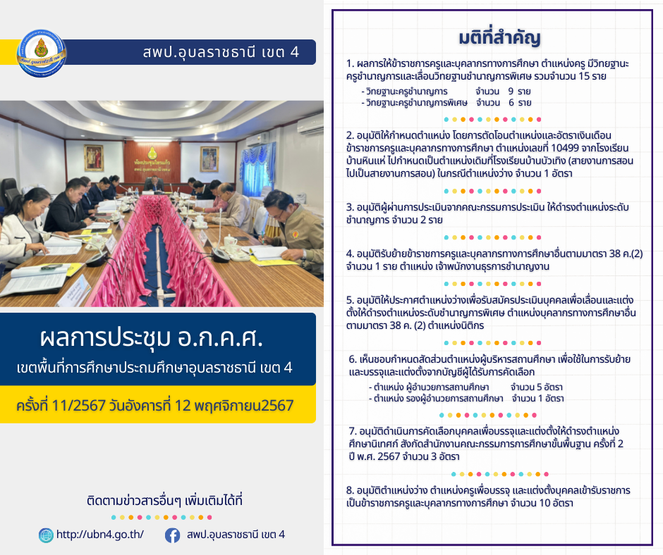 ผลการประชุม อ.ก.ค.ศ. เขตพื้นที่การศึกษาประถมศึกษาอุบลราชธานี เขต 4 ครั้งที่ 11/2567 อ.ก.ค.ศ. เขตพื้นที่การศึกษา ผลการประชุม อ.ก.ค.ศ. มติ อ.ก.ค.ศ.ปี67