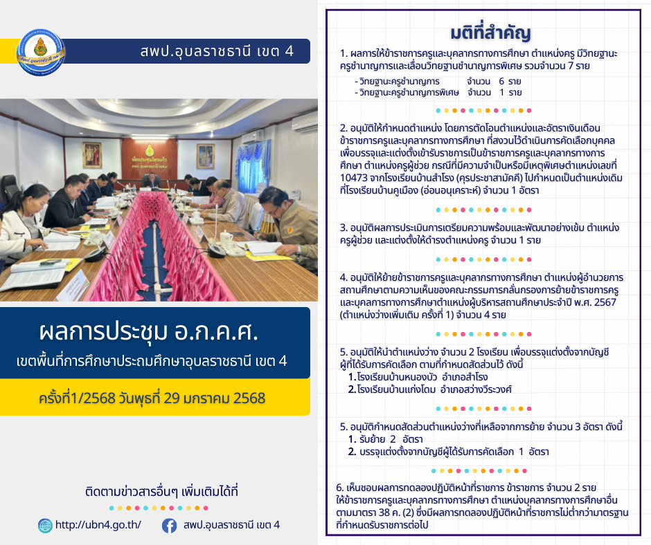 ผลการประชุม อ.ก.ค.ศ. เขตพื้นที่การศึกษาประถมศึกษาอุบลราชธานี เขต 4 ครั้งที่ 1/2568 อ.ก.ค.ศ. เขตพื้นที่การศึกษา ผลการประชุม อ.ก.ค.ศ. มติอ.ก.ค.ศ.ปี68