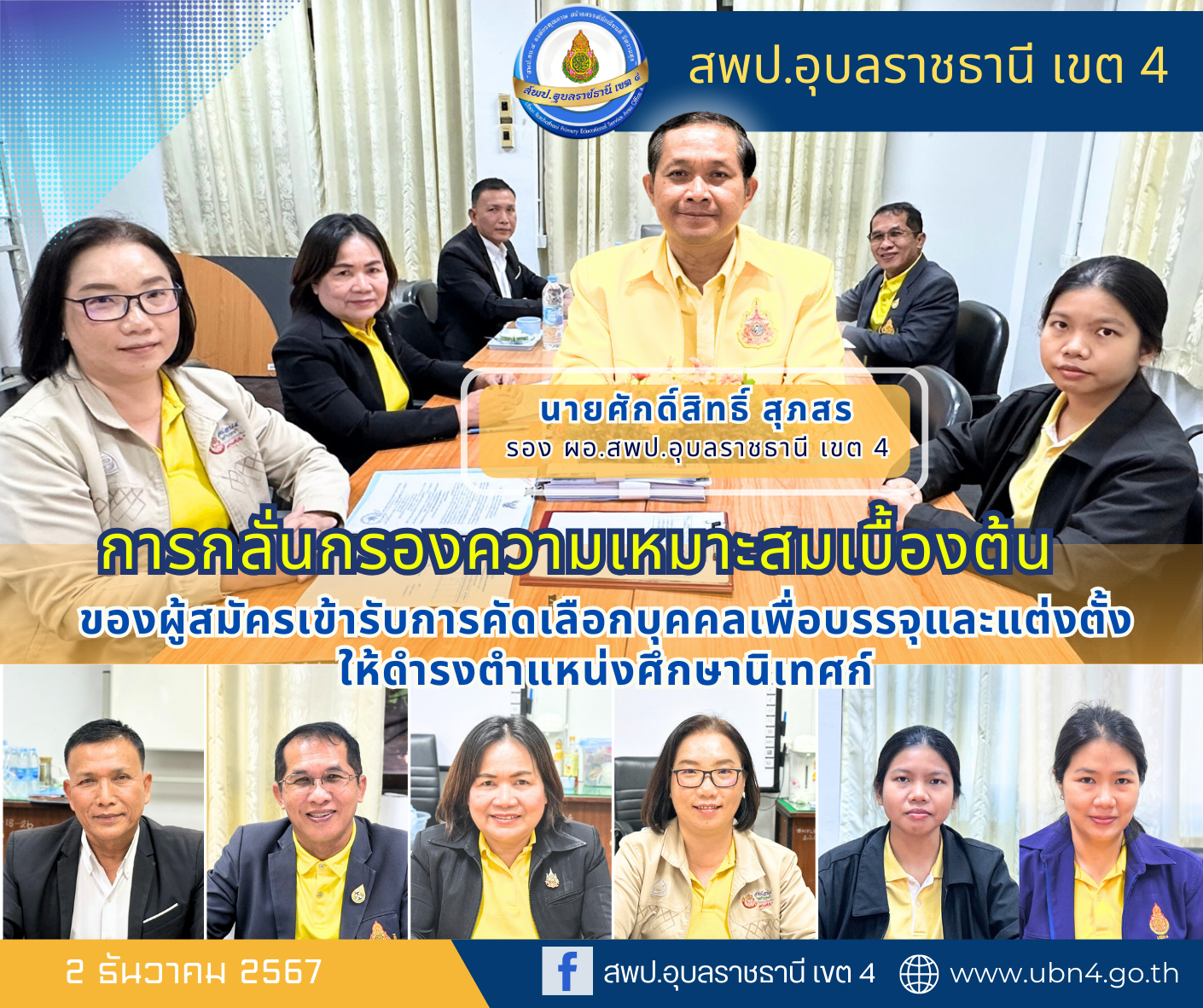 เมื่อวันที่ 2 ธันวาคม 2567 นางสาวปุณยนุช ดวงศรี ผู้อำนวยการ สพป.อุบลราชธานี เขต 4 มอบหมายให้ นายศักดิ์สิทธิ์ สุภสร รองผู้อำนวยการ สพป.อุบลราชธานี เขต 4 เป็นประธานในการกลั่นกรองความเหมาะสมเบื้องต้นของผู้สมัครเข้ารับการคัดเลือกบุคคลเพื่อบรรจุและแต่งตั้งให้ดำรงตำแหน่งศึกษานิเทศก์ สังกัดสำนักงานคณะกรรมการการศึกษาขั้นพื้นฐาน ครั้งที่ 2 ปี พ.ศ.2567 ณ ห้องประชุมนิเทศ สำนักงานเขตพื้นที่การศึกษาประถมศึกษาอุบลราชธานี เขต 4