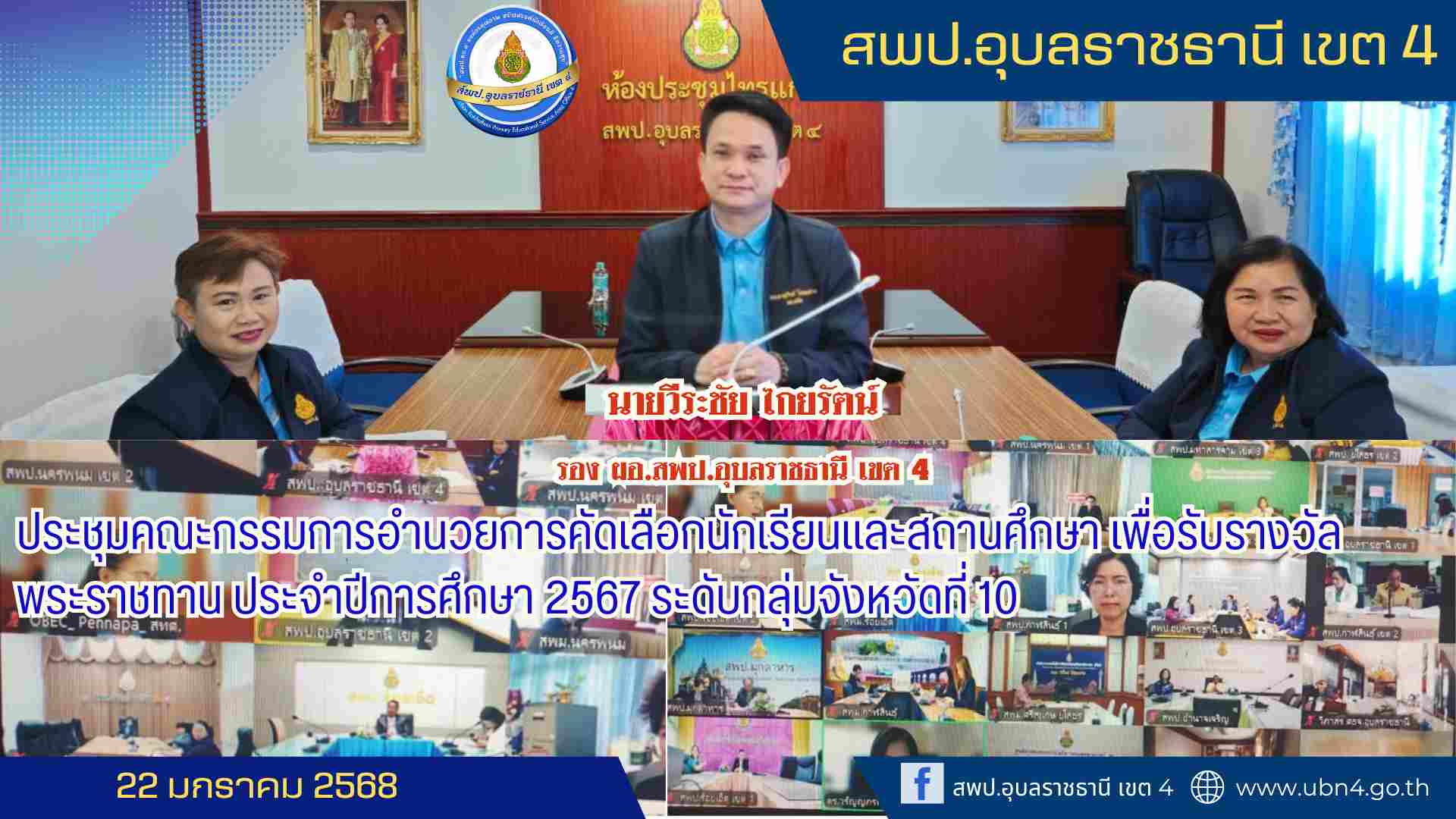 ส.อ.หญิงพวงรัตน์ สุธา นักวิชาการศึกษาชำนาญการ เข้าร่วมประชุมผ่านระบบทางไกล Zoom Meeting ประชุมคณะกรรมการอำนวยการ เพื่อวางแผนการประเมิน และพิจารณาแต่งตั้งคณะกรรมการประเมิน การคัดเลือกนักเรียนและสถานศึกษา เพื่อรับรางวัลพระราชทาน ระดับการศึกษาขั้นพื้นฐาน ประจำปีการศึกษา 2567 ระดับกลุ่มจังหวัดที่ 10 ครั้งที่ 1/2568 โดยมี นางวรัญญภรณ์ ชาลีรักษ์ ผู้อำนวยการสำนักพัฒนากิจกรรมนักเรียนสำนักงานคณะกรรมการการศึกษาขั้นพื้นฐาน เป็นประธานในการประชุม มีสำนักงานเขตพื้นที่การศึกษาประถมศึกษาอุบลราชธานี เขต 3 เป็นศูนย์ประสานงานการคัดเลือก ระดับกลุ่มจังหวัดที่ 10