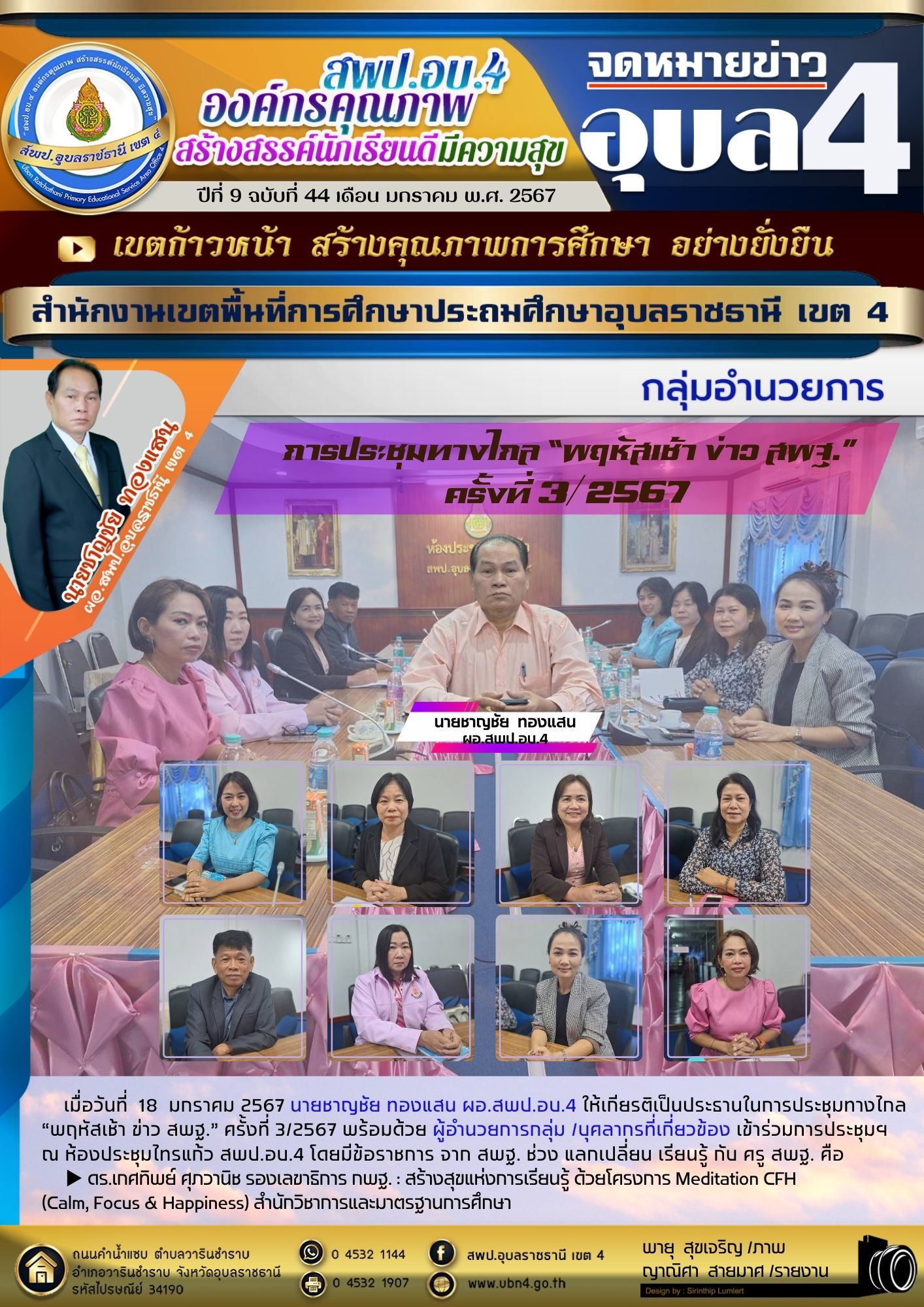 การประชุมทางไกล"พฤหัสเช้า ข่าว สพฐ."ครั้งที่ 3/2567 ภารกิจ ผอ.สพป.อุบลราชธานี เขต 4 จดหมายข่าวทุกกลุ่ม . ก่อนหน้า ต่อไป