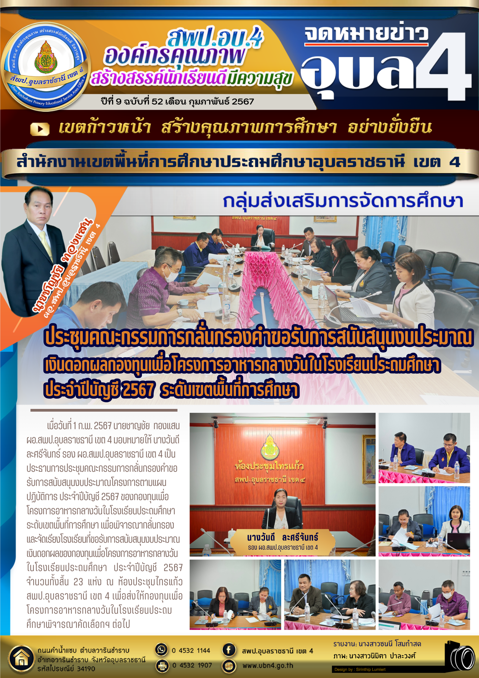 ประชุมคณะกรรมการกลั่นกรองคำขอรับการสนับสนุนงบประมาณเงินดอกผลกองทุนเพื่อโครงการอาหารกลางวันในโรงเรียนประถมศึกษาประจำปีบัญชี2567 ระดับเขตพื้นที่การศึกษา จดหมายข่าวกลุ่มส่งเสริมการจัดการศึกษา ก่อนหน้า ต่อไป