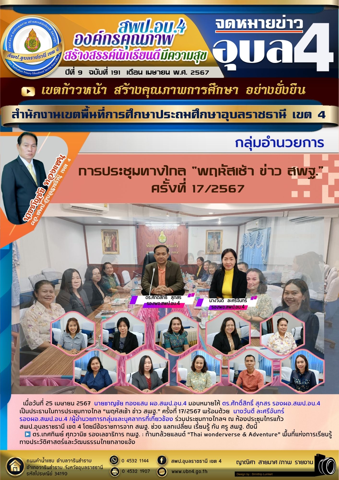การประชุมทางไกล พฤหัสเช้า ข่าว สพฐ. ครั้งที่17 ปี พ.ศ. 2567 จดหมายข่าวกลุ่มอำนวยการ ภารกิจ ผอ.สพป.อุบลราชธานี เขต 4 ภารกิจ ดร.ศักดิ์สิทธิ์ สุภสร จดหมายข่าวทุกกลุ่ม ก่อนหน้า ต่อไป