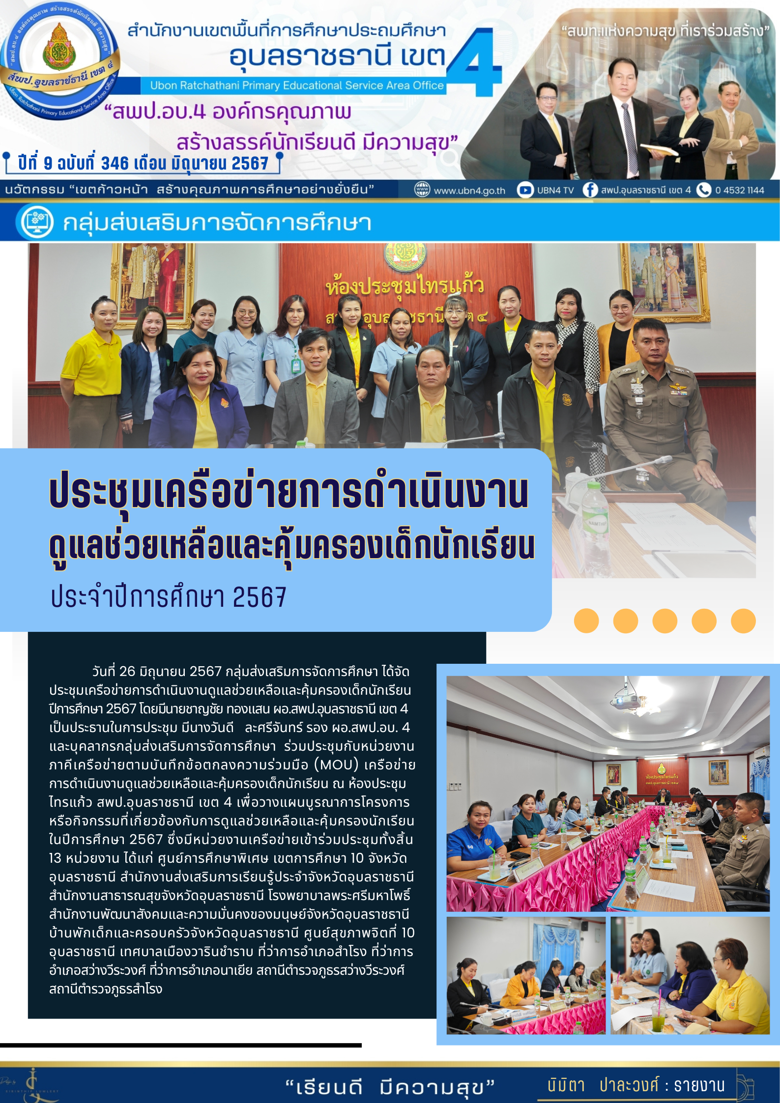 ประชุมเครือข่ายการดำเนินงานดูแลช่วยเหลือและคุ้มครองเด็กนักเรียน ประจำปีการศึกษา 2567 จดหมายข่าวกลุ่มส่งเสริมการจัดการศึกษา ภารกิจ ผอ.สพป.อุบลราชธานี เขต 4 ก่อนหน้า ต่อไป