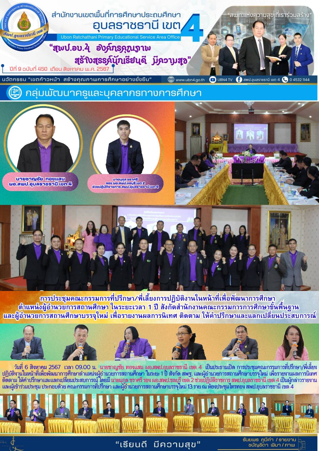 การประชุมคณะกรรมการที่ปรึกษา/พี่เลี้ยง การปฏิบัติงานในหน้าที่เพื่อพัฒนาการศึกษาตำแหน่งผู้อำนวยการสถานศึกษา ในระยะเวลา 1 ปี สังกัดสำนักงานคณะกรรมการการศึกษาขั้นพื้นฐาน และผู้อำนวยการสถานศึกษาที่บรรจุใหม่ เพื่อรายงานผลการนิเทศ ติดตาม ให้คำปรึกษาและแลกเปลี่ย จดหมายข่าวกลุ่มพัฒนาครูและบุคลากรทางการศึกษา ภารกิจ ผอ.สพป.อุบลราชธานี เขต 4 ภารกิจ รอง ผอ.สพป.อุบลราชธานี เขต 4 ก่อนหน้า ต่อไป
