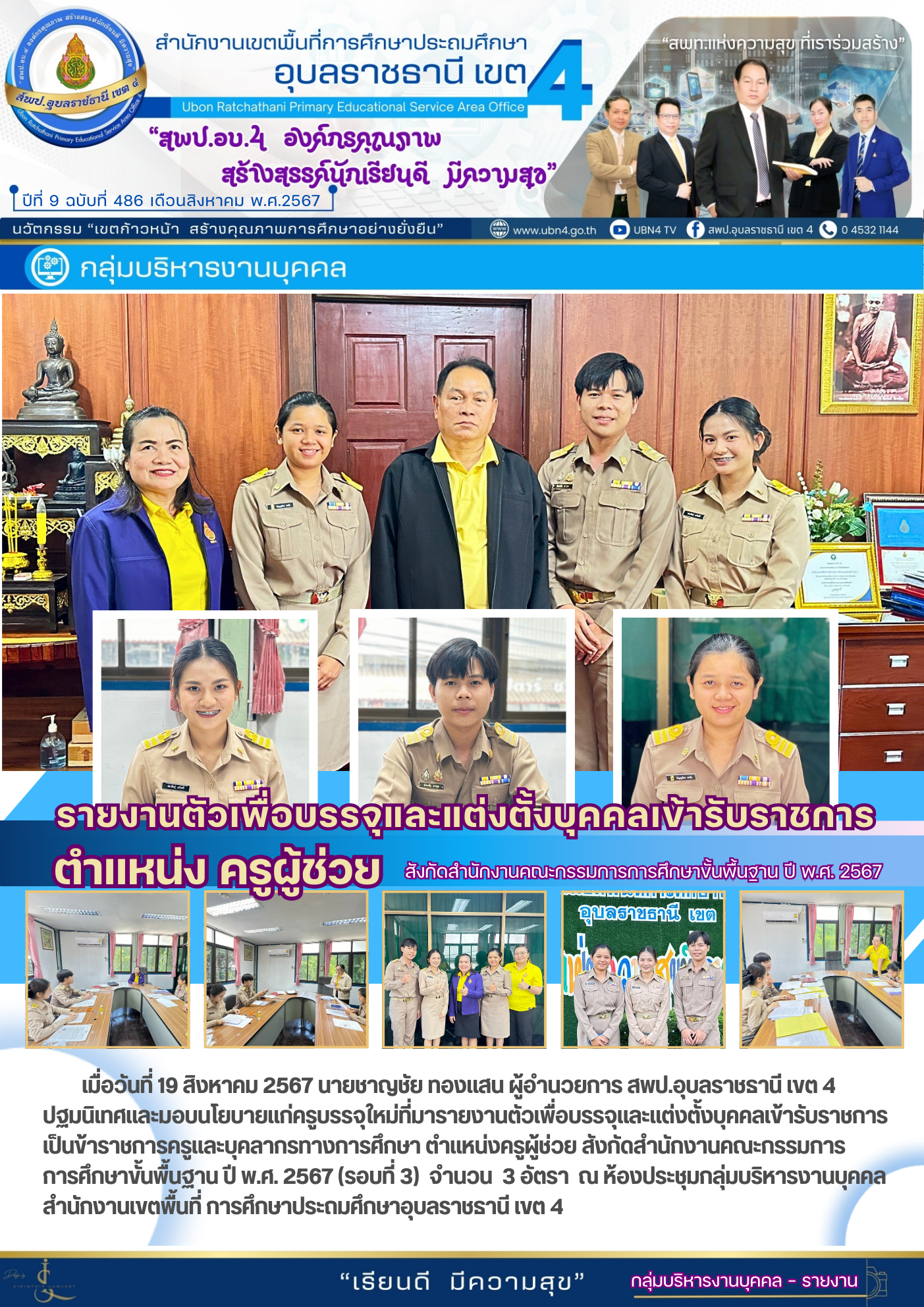 รายงานตัวเพื่อบรรจุและแต่งตั้งบุคลากรเข้ารับราชการ ตำแหน่ง ครูผู้ช่วย ปี พ.ศ.2567 จดหมายข่าวส่วนกลาง จดหมายข่าวกลุ่มบริหารงานบุคคล ภารกิจ ผอ.สพป.อุบลราชธานี เขต 4 ก่อนหน้า ต่อไป