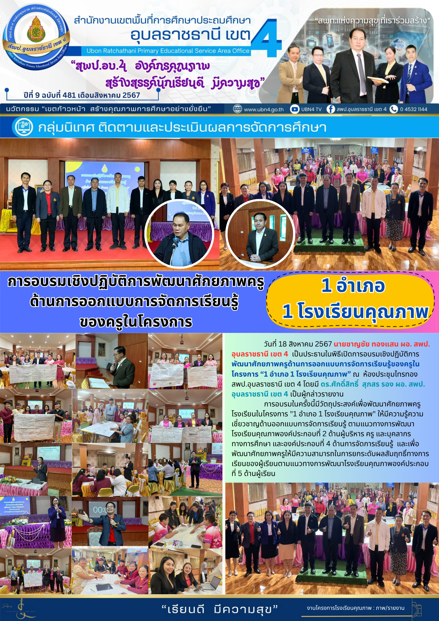การอบรมเชิงปฏิบัติการพัฒนาศักยภาพครู ด้านการออกแบบการจัดการเรียนรู้ของครูในโครงการ 1 อำเภอ 1 โรงเรียนคุณภาพ จดหมายข่าวกลุ่มนิเทศ ติดตามและประเมินผลการจัดการศึกษา ภารกิจ ผอ.สพป.อุบลราชธานี เขต 4 ภารกิจ ดร.ศักดิ์สิทธิ์ สุภสร ก่อนหน้า ต่อไป