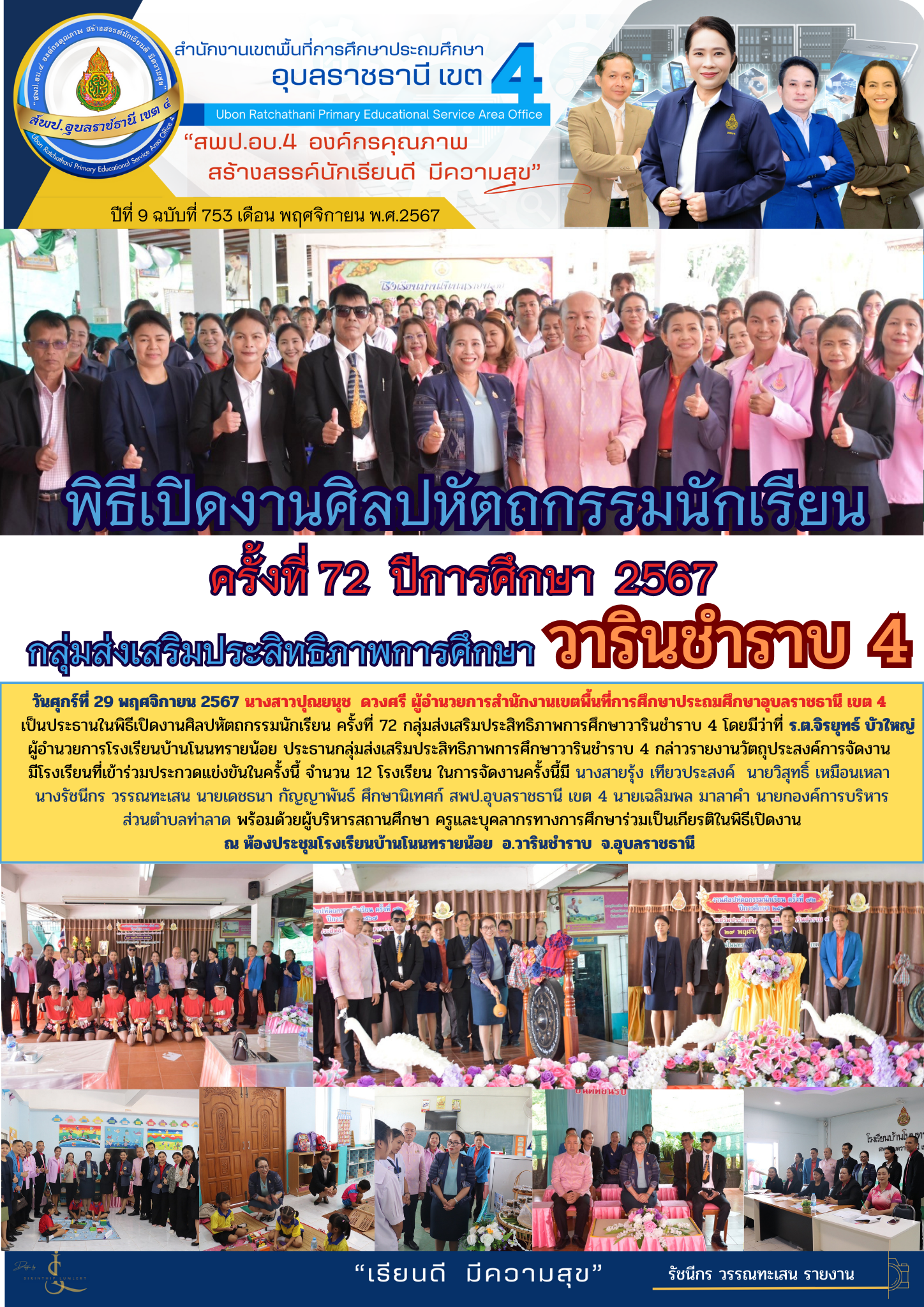พิธีเปิดงานศิลปหัตถกรรมนักเรียน ครั้งที่ 72 ปีการศึกษา 2567 กลุ่มส่งเสริมประสิทธิภาพการศึกษา วารินชำราบ 4 จดหมายข่าวกลุ่มนิเทศ ติดตามและประเมินผลการจัดการศึกษา ภารกิจ ผอ.สพป.อุบลราชธานี เขต 4 ก่อนหน้า ต่อไป