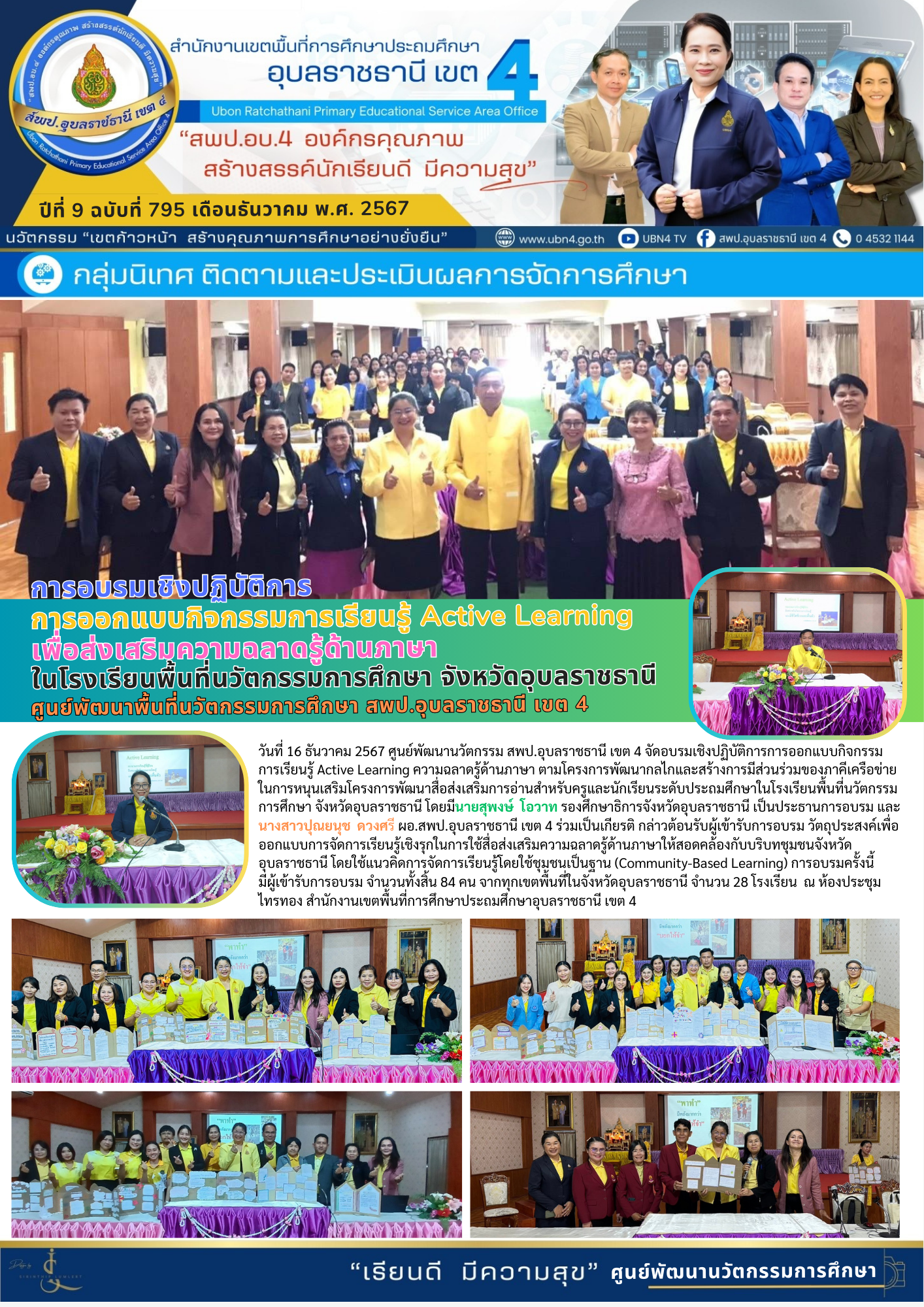 การอบรมเชิงปฏิบัติการ การออกแบบกิจกรรมการเรียนรู้ Active Learning เพื่อส่งเสริมความฉลาดรู้ด้านภาษา ในโรงเรียนพื้นที่นวัตกรรมการศึกษา จังหวัดอุบลราชธานี ศูนย์พัฒนาพื้นที่นวัตกรรมการศึกษา สพป.อุบลราชธานี เขต 4 จดหมายข่าวกลุ่มนิเทศ ติดตามและประเมินผลการจัดการศึกษา ภารกิจ ผอ.สพป.อุบลราชธานี เขต 4 ก่อนหน้า ต่อไป