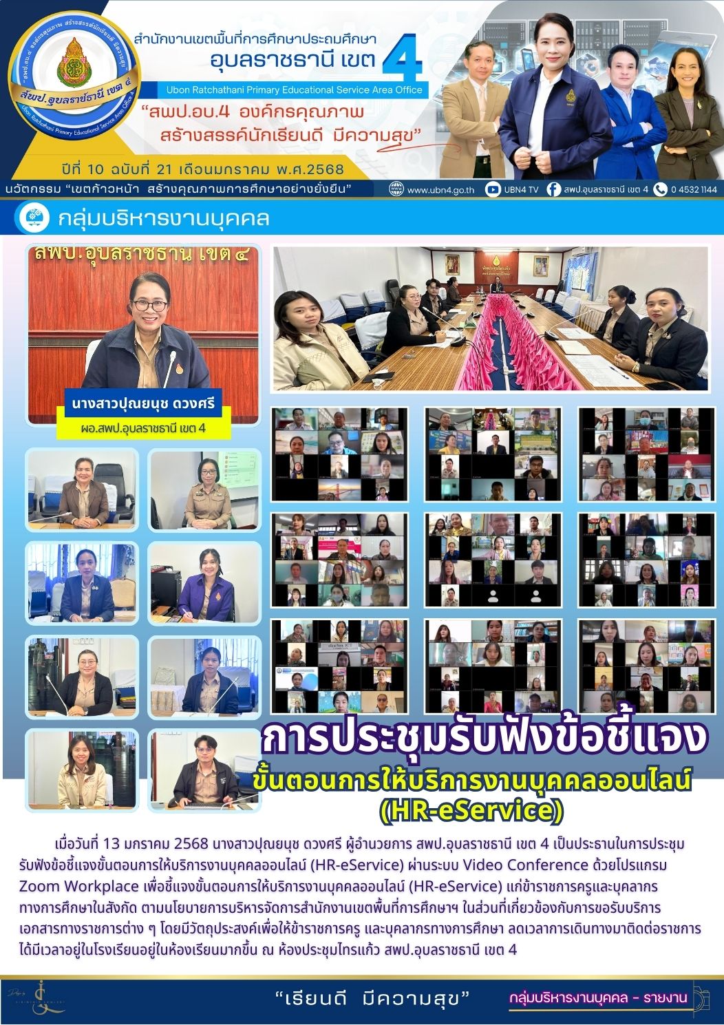 การประชุมรับฟังข้อชี้แจงขั้นตอนการให้บริการงานบุคคลออนไลน์ (HR-eService) จดหมายข่าวกลุ่มบริหารงานบุคคล ภารกิจ รอง ผอ.สพป.อุบลราชธานี เขต 4 ก่อนหน้า ต่อไป