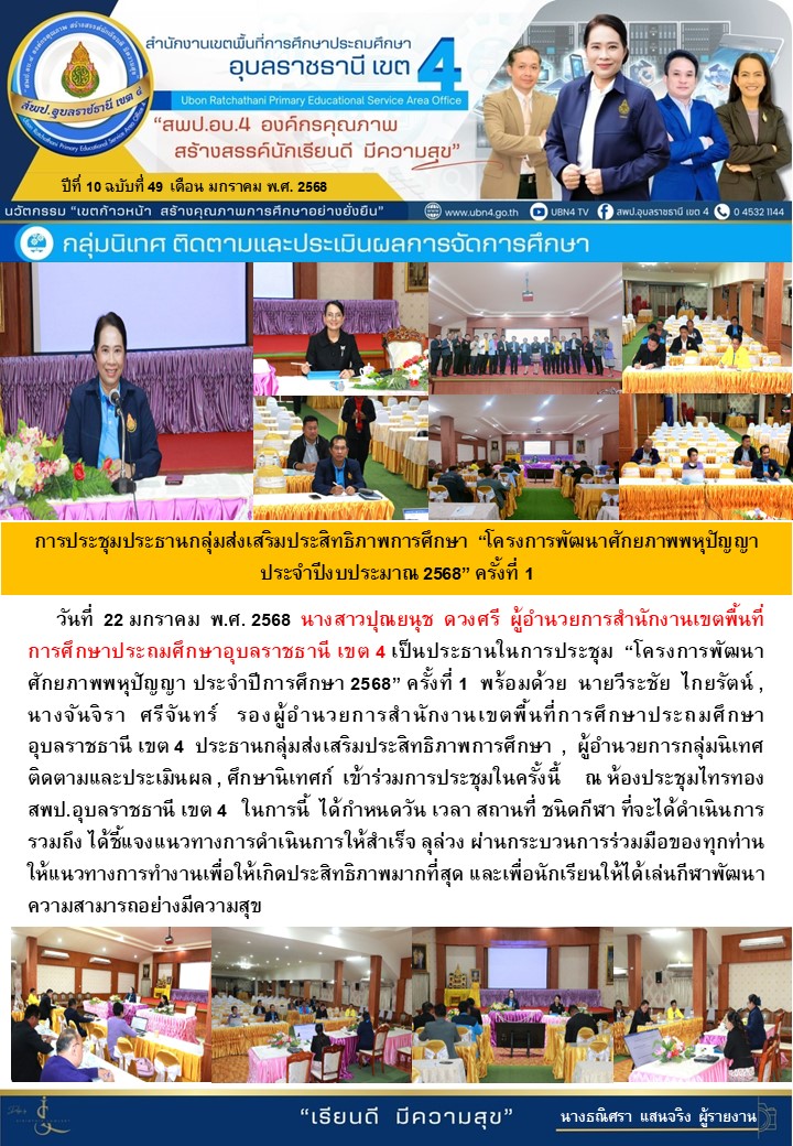 การประชุมประธานกลุ่มส่งเสริมประสิทธิภาพการศึกษา "โครงการพัฒนาศักยภาพพหุปัญญา ประจำปีงบประมาณ 2568" ครั้งที่ 1 ภารกิจ ผอ.สพป.อุบลราชธานี เขต 4 ภารกิจ นายวีระชัย ไกยรัตน์ ภารกิจ นางจันจิรา ศรีจันทร์ ก่อนหน้า ต่อไป