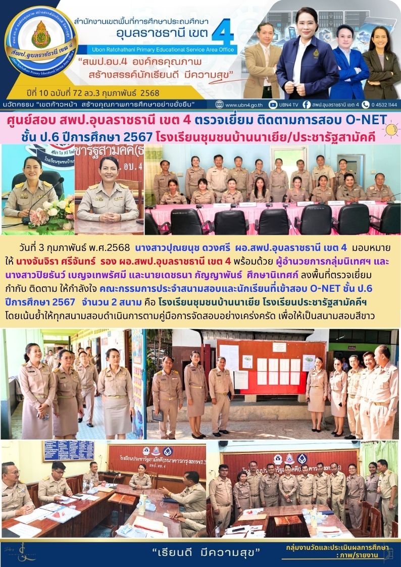 ศูนย์สอบ สพป.อุบลราชธาชธานีเขต 4 ตรวจเยี่ยม ติดตามการสอบ O-Net ชั้น ป.6 ปีการศึกษา 2567 โรงเรียนชุมชนบ้านนาเยีย/ประชารัฐสามัคคี ภารกิจ นางจันจิรา ศรีจันทร์ ก่อนหน้า ต่อไป