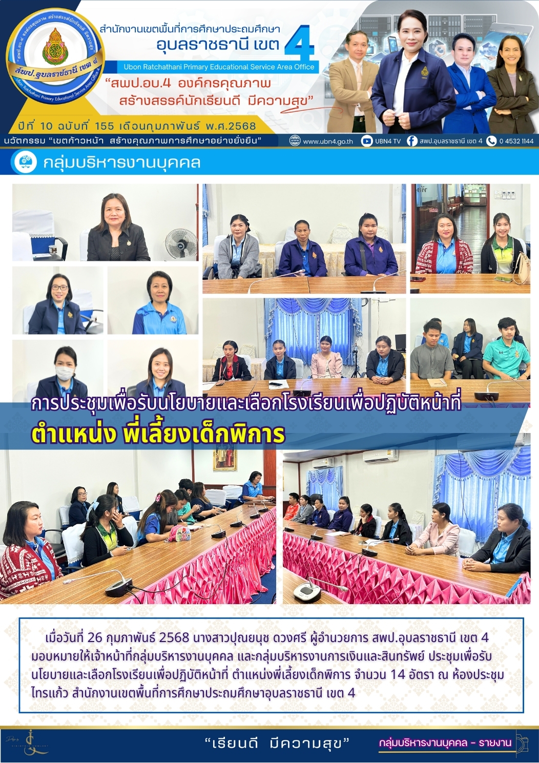 การประชุมเพื่อรับนโยบายและเลือกโรงเรียนเพื่อปฏิบัติหน้าที่ ตำแหน่งพี่เลี้ยงเด็กพิการ จดหมายข่าวกลุ่มบริหารงานบุคคล ก่อนหน้า ต่อไป