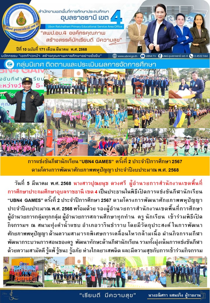 การแข่งขันกีฬานักเรียน "UBN4 GAMES" ครั้งที่ 2 ประจำปีการศึกษา 2567 ตามโครงการพัฒนาศักยภาพพหุปัญญา ประจำปีงบประมาณ พ.ศ. 2568 ภารกิจ ผอ.สพป.อุบลราชธานี เขต 4 ภารกิจ ดร.ศักดิ์สิทธิ์ สุภสร ภารกิจ นายวีระชัย ไกยรัตน์ ภารกิจ นางจันจิรา ศรีจันทร์ ก่อนหน้า ต่อไป