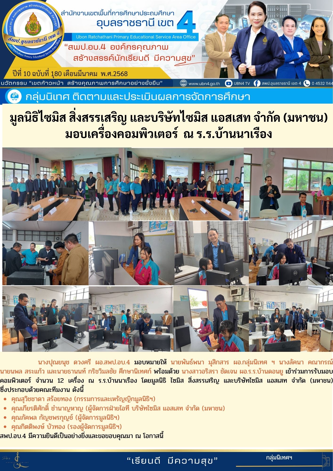 มูลนิธิไซมิส สิ่งสรรเสริญและบริษัทไซมิส แอสเสท จำกัด(มหาชน) มอบเครื่องคอมพิวเตอร์ ณ โรงเรียนบ้านนาเรือง ก่อนหน้า ต่อไป