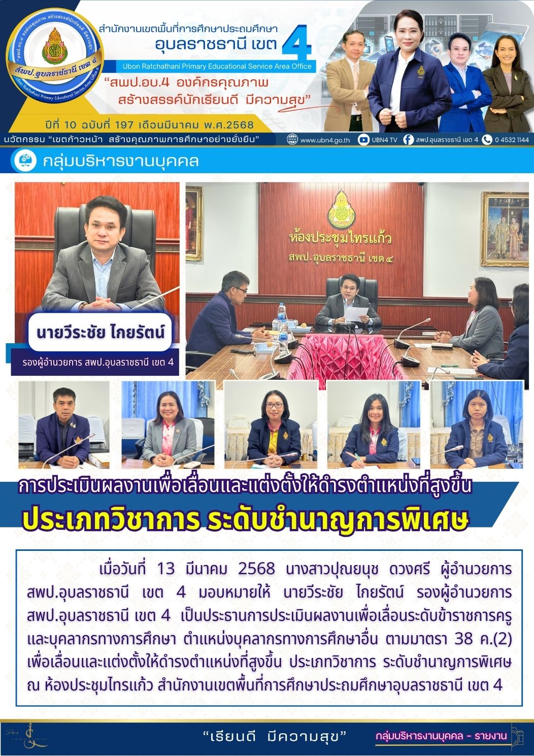 การประเมินผลงานเพื่อเลื่อนและแต่งตั้งให้ดำรงตำแหน่งที่สูงขึ้น ประเภทวิชาการ ระดับชำนาญการพิเศษ จดหมายข่าวกลุ่มบริหารงานบุคคล ภารกิจ รอง ผอ.สพป.อุบลราชธานี เขต 4 ภารกิจ นายวีระชัย ไกยรัตน์ ก่อนหน้า ต่อไป