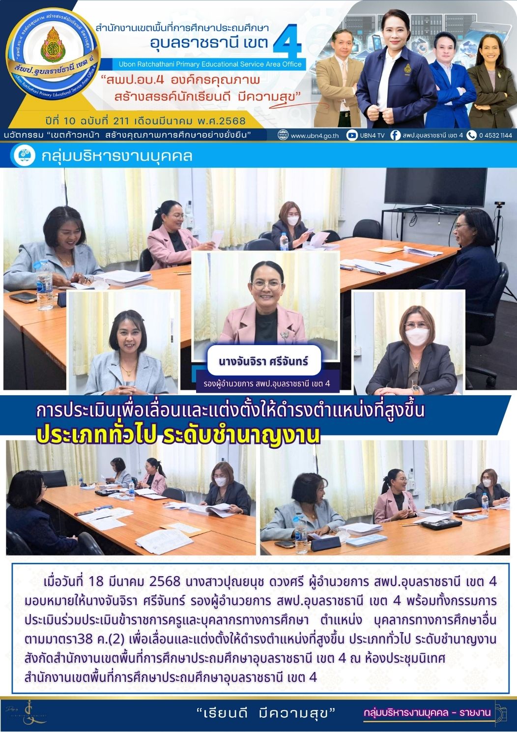 การประเมินเพื่อเลื่อนและแต่งตั้งให้ดำรงตำแหน่งที่สูงขึ้น ประเภททั่วไป ระดับชำนาญงาน จดหมายข่าวกลุ่มบริหารงานบุคคล ภารกิจ รอง ผอ.สพป.อุบลราชธานี เขต 4 ภารกิจ นางจันจิรา ศรีจันทร์ ก่อนหน้า ต่อไป