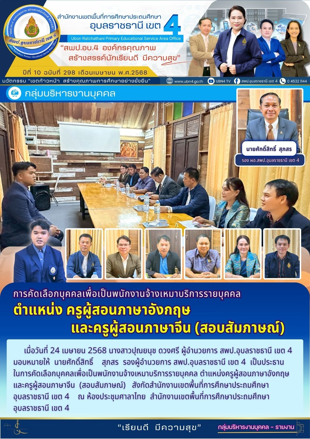 การคัดเลือกบุคคลเพื่อเป็นพนักงานจ้างเหมาบริการรายบุคคล ตำแหน่งครูผู้สอนภาษาอังกฤษและครูผู้สอนภาษาจีน (สอบสัมภาษณ์) จดหมายข่าวกลุ่มบริหารงานบุคคล ภารกิจ รอง ผอ.สพป.อุบลราชธานี เขต 4 ภารกิจ ดร.ศักดิ์สิทธิ์ สุภสร ก่อนหน้า ต่อไป