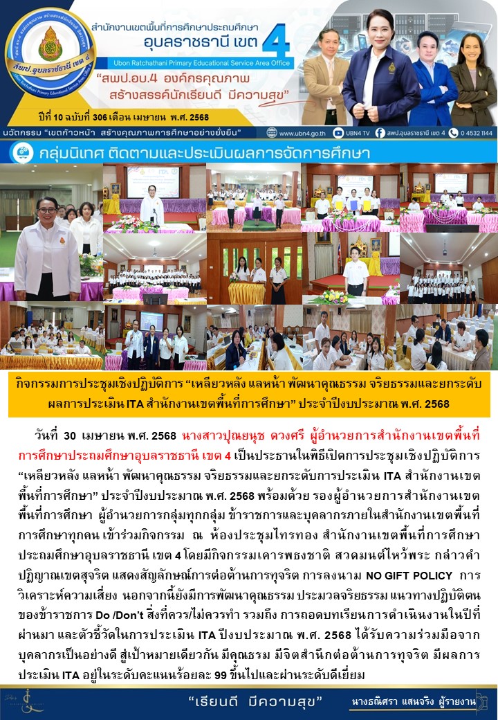 กิจกรรมการประชุมเชิงปฏิบัติการ "เหลี่ยวหลัง แลหน้า พัฒนาคุณธรรม จริยธรรมและยกระดับผลการประเมิน ITA สำนักงานเขตพื้นที่การศึกษา" ประจำปีงบประมาณ พ.ศ. ๒๕๖๘ ภารกิจ ผอ.สพป.อุบลราชธานี เขต 4 ก่อนหน้า ต่อไป
