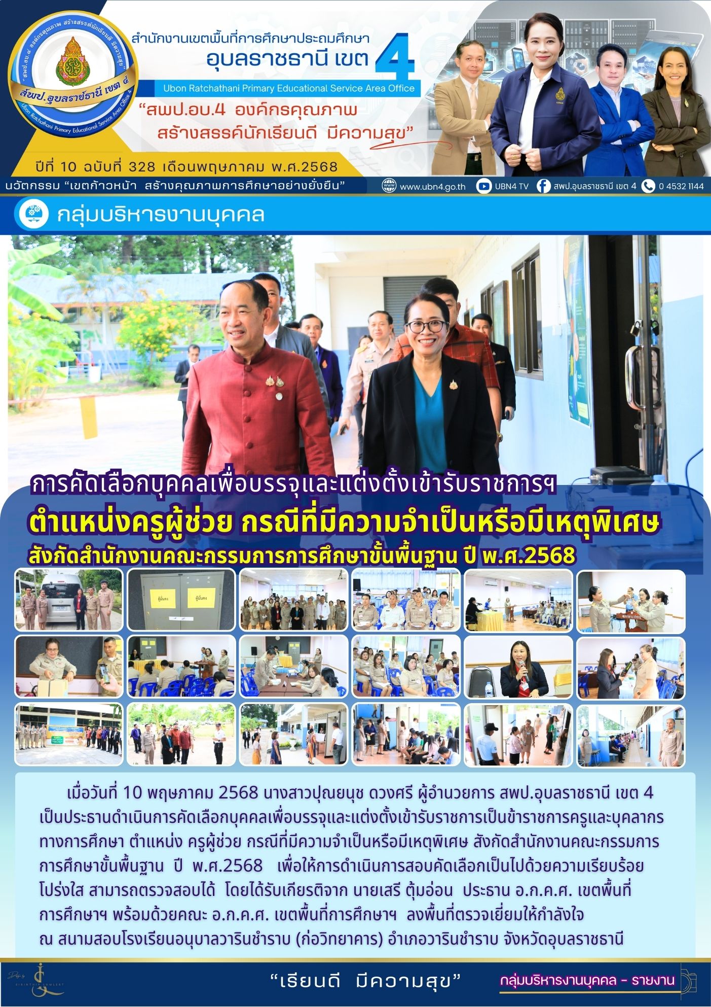 การคัดเลือกบุคคลเพื่อบรรจุและแต่งตั้งเข้ารับราชการฯ ตำแหน่งครูผู้ช่วย กรณีที่มีความจำเป็นหรือมีเหตุพิเศษ สังกัดสำนักงานคณะกรรมการการศึกษาขั้นพื้นฐาน ปี พ.ศ.2568 จดหมายข่าวกลุ่มบริหารงานบุคคล ภารกิจ ผอ.สพป.อุบลราชธานี เขต 4 ภารกิจ รอง ผอ.สพป.อุบลราชธานี เขต 4 ภารกิจ ดร.ศักดิ์สิทธิ์ สุภสร ก่อนหน้า ต่อไป