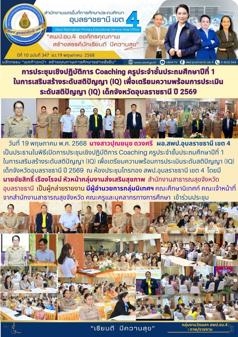 การประชุมเชิงปฏิบัติการ Coaching ครูประจำชั้นประถมศึกษาปีที่ 1 ในการเสริมสร้างระดับสิตปัญญา (IQ) เพื่อเตรียมความพร้อมการประเมินระดับสติปัญญา (IQ) เด็กจังหวัดอุบลราชธานี ปี 2569 ภารกิจ ผอ.สพป.อุบลราชธานี เขต 4 ก่อนหน้า ต่อไป