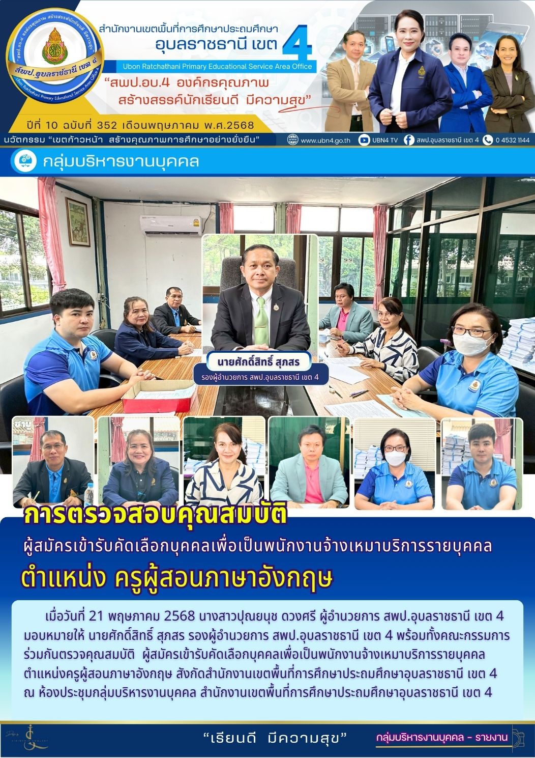 การตรวจสอบคุณสมบัติ ผู้สมัครเข้ารับคัดเลือกบุคคลเพื่อเป็นพนักงานจ้างเหมาบริการรายบุคคล ตำแหน่งครูผู้สอนภาษาอังกฤษ จดหมายข่าวกลุ่มบริหารงานบุคคล ภารกิจ รอง ผอ.สพป.อุบลราชธานี เขต 4 ภารกิจ ดร.ศักดิ์สิทธิ์ สุภสร ก่อนหน้า ต่อไป