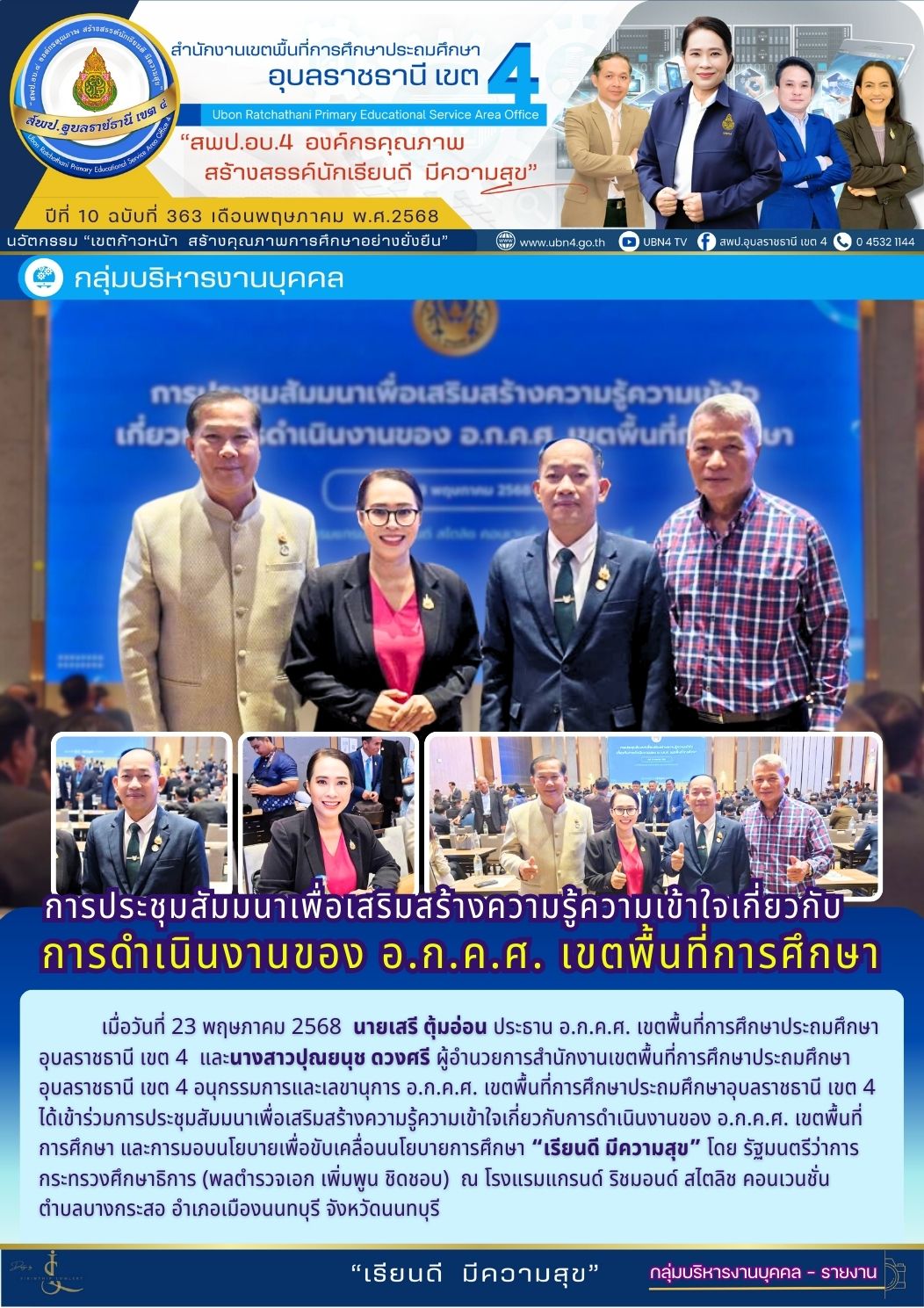 การประชุมสัมมนาเพื่อเสริมสร้างความรู้ความเข้าใจเกี่ยวกับการดำเนินงานของ อ.ก.ค.ศ. เขตพื้นที่ การศึกษา จดหมายข่าวกลุ่มบริหารงานบุคคล ภารกิจ ผอ.สพป.อุบลราชธานี เขต 4 ก่อนหน้า ต่อไป