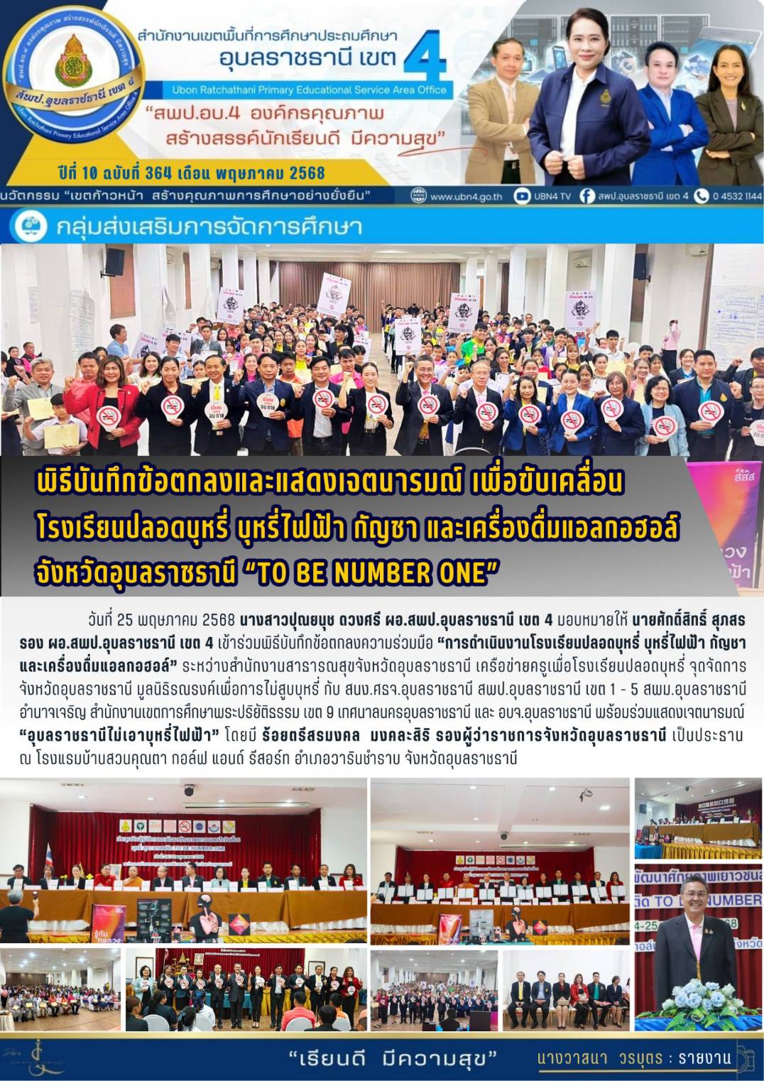 พิธีบันทึกข้อตกลงและแสดงเจตนารมณ์ เพื่อขับเคลื่อนโรงเรียนปลอดบุหรี่ บุหรี่ไฟฟ้า กัญชา และเครื่องดื่มแอลกอฮอล์ จังหวัดอุบลราชธานี "TO BE NUMBER ONE" จดหมายข่าวส่วนกลาง จดหมายข่าวกลุ่มส่งเสริมการจัดการศึกษา ก่อนหน้า ต่อไป
