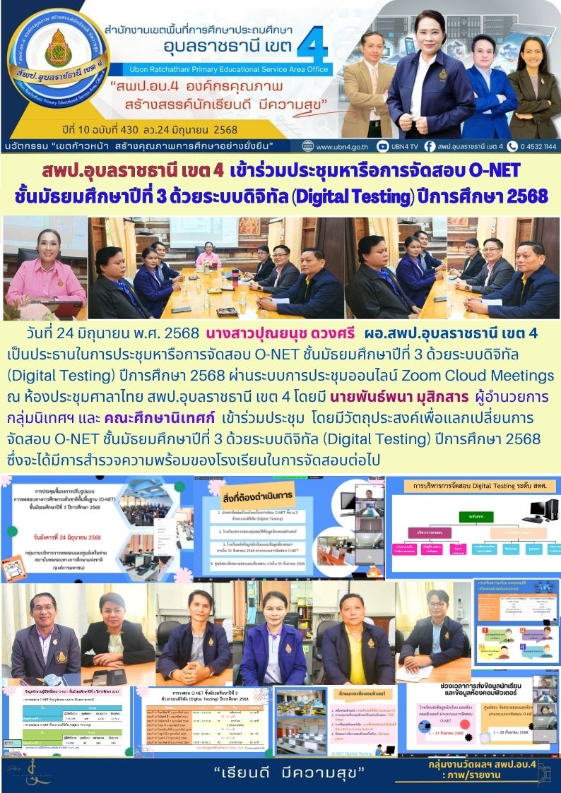 สพป.อุบลราชธานี เขต 4 เข้าร่วมประชุมหารือการจัดสอบ O-NET ชั้นมัธยมศึกษาปีที่ 3 ด้วยระบบดิจิตัล (Digital Testing) ปีการศึกษา 2568 ภารกิจ ผอ.สพป.อุบลราชธานี เขต 4 ก่อนหน้า ต่อไป