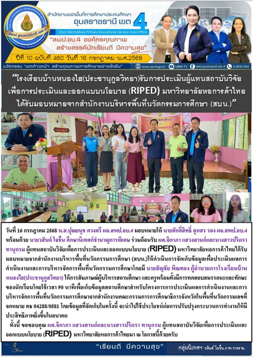"โรงเรียนบ้านหนองไฮ (ประชานุกูลวิทยา) รับการประเมินผู้แทนสถาบันวิจัย เพื่อการประเมินและออกแบบนโยบาย (RIPED) มหาวิทยาลัยหอ การค้าไทย ได้รับมอบหมายจากสำนักงานบริหารพื้นที่นวัตกรรมการศึกษา (สบน.) " ภารกิจ ดร.ศักดิ์สิทธิ์ สุภสร ก่อนหน้า ต่อไป