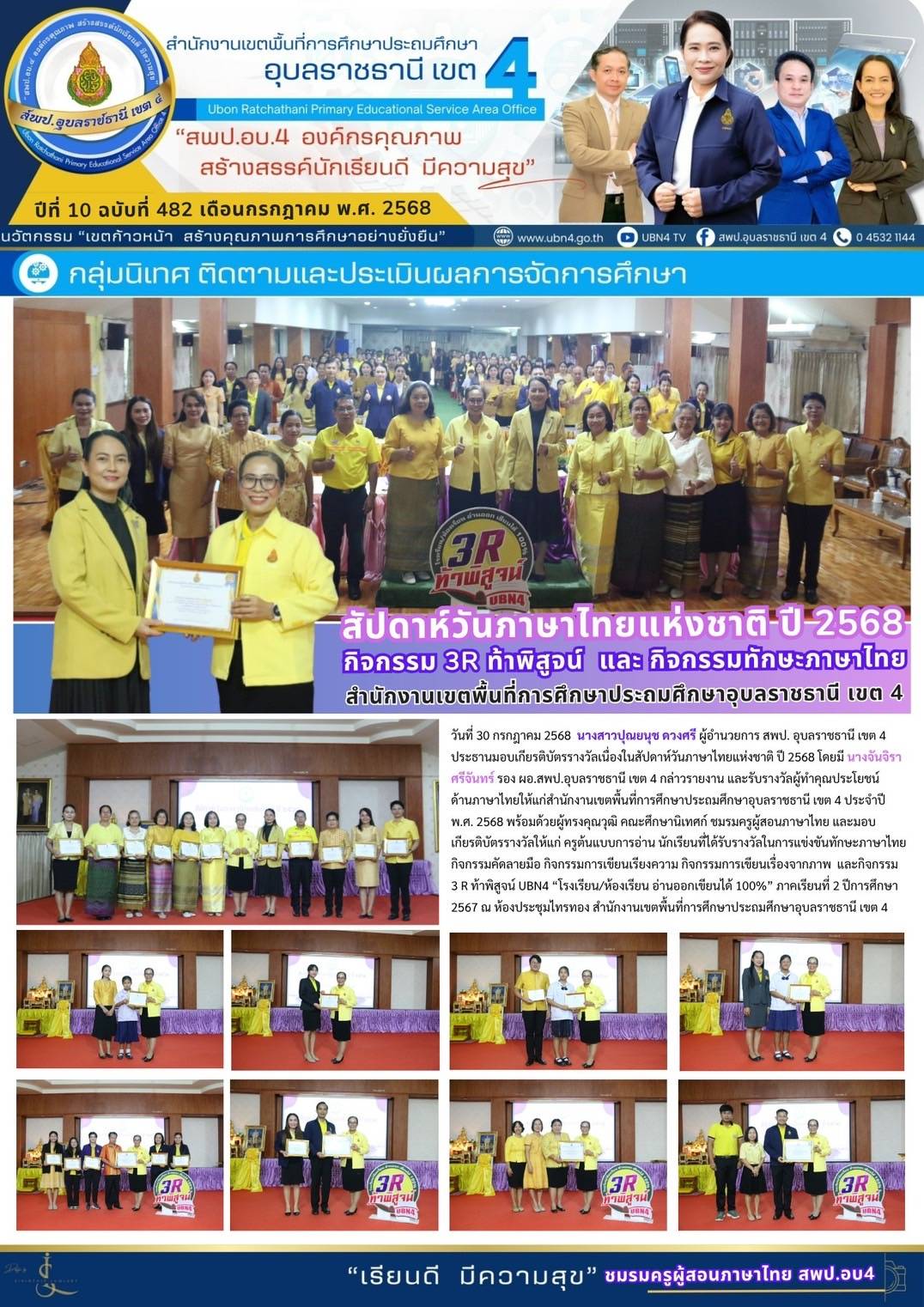 สัปดาห์วันภาษาไทยแห่งชาติ ปี 2568 กิจกรรม 3R ท้าพิสูจน์และกิจกรรมทักษะภาษาไทย สำนักงานเขตพื้นที่การศึกษาประถมศึกษาอุบลราชธานี เขต 4 ภารกิจ ผอ.สพป.อุบลราชธานี เขต 4 ภารกิจ นางจันจิรา ศรีจันทร์ ก่อนหน้า ต่อไป