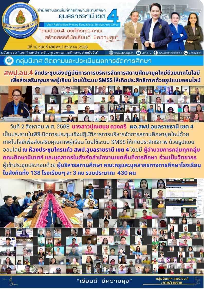 สพป.อบ 4 จัดประชุมเชิงปฏิบัติการการบริหารจัดการสถานศึกษายุคใหม่ด้วยเทคโนโลยีเพื่อส่งเสริมคุณภาพผู้เรียน โดยใช้ระบบ SMSS ให้เกิดประสิทธิภาพด้วยรูปแบบออนไลน์ ภารกิจ ผอ.สพป.อุบลราชธานี เขต 4 ก่อนหน้า ต่อไป