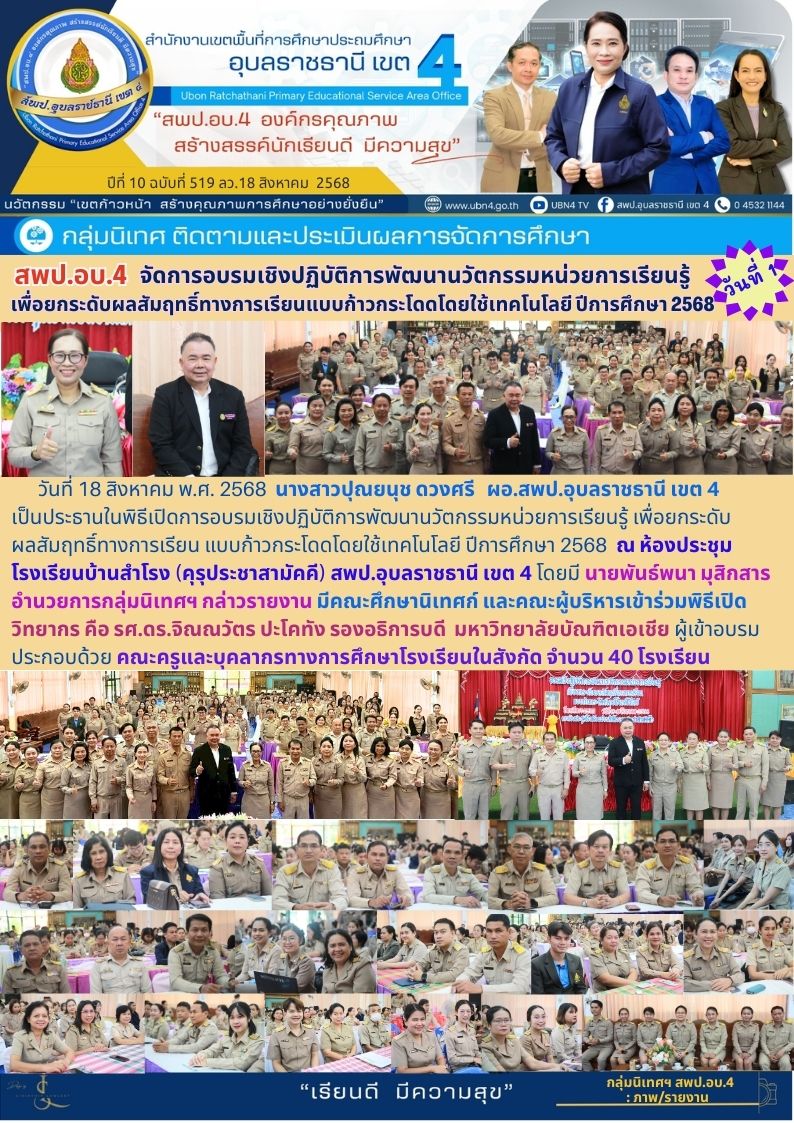 สพป.อบ 4 จัดอบรมเชิงปฏิบัติการเพื่อพัฒนานวัตกรรมหน่วยการเรียนรู้เพื่อยกระดับผลสัมฤทธิ์ทางการเรียนแบบก้าวกระโดดโดยใช้เทคโนโลยี ปีการศึกษา 2568 (วันที่ 1) ภารกิจ ผอ.สพป.อุบลราชธานี เขต 4 ก่อนหน้า ต่อไป