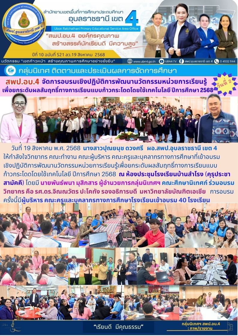 สพป.อบ 4 จัดอบรมเชิงปฏิบัติการเพื่อพัฒนานวัตกรรมหน่วยการเรียนรู้เพื่อยกระดับผลสัมฤทธิ์ทางการเรียนแบบก้าวกระโดดโดยใช้เทคโนโลยี ปีการศึกษา 2568 (วันที่ 2) ภารกิจ ผอ.สพป.อุบลราชธานี เขต 4 ก่อนหน้า ต่อไป