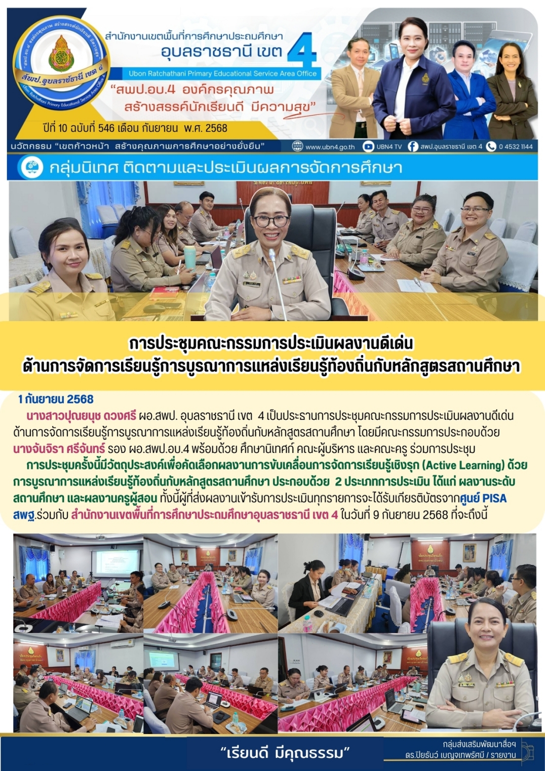 การประชุมคณะกรรมการประเมินผลงานดีเด่นด้านการจัดการเรียนรู้การบูรณาการแหล่งเรียนรู้ท้องถิ่นกับหลักสูตรสถานศึกษา ภารกิจ ผอ.สพป.อุบลราชธานี เขต 4 ภารกิจ นางจันจิรา ศรีจันทร์ ก่อนหน้า ต่อไป