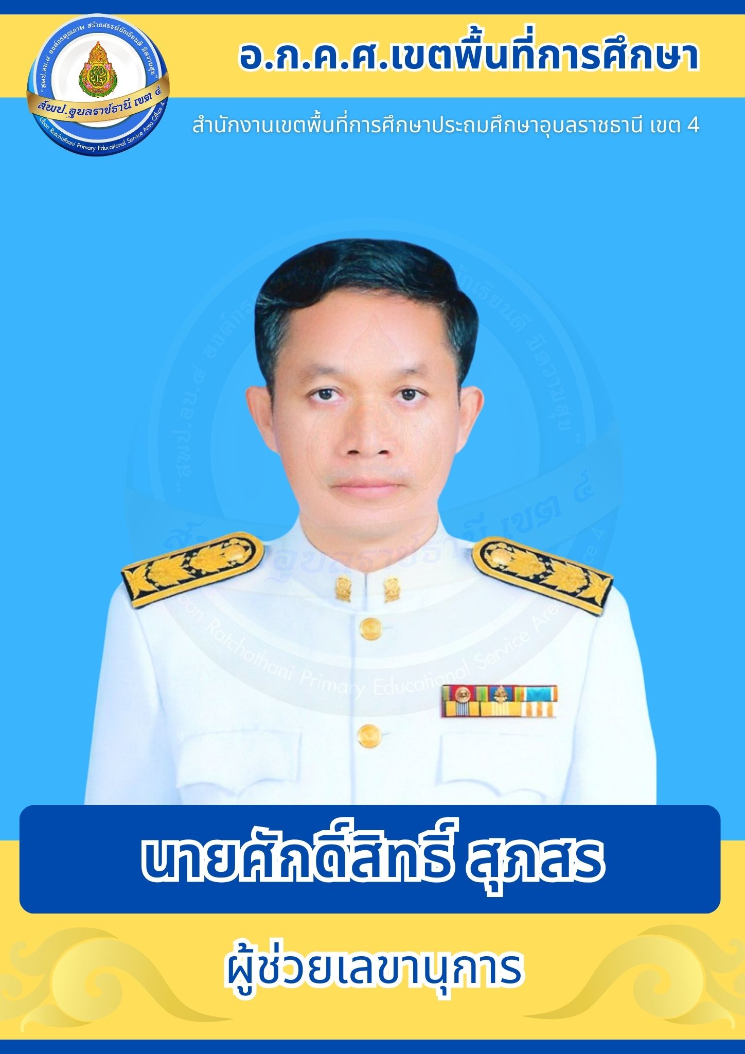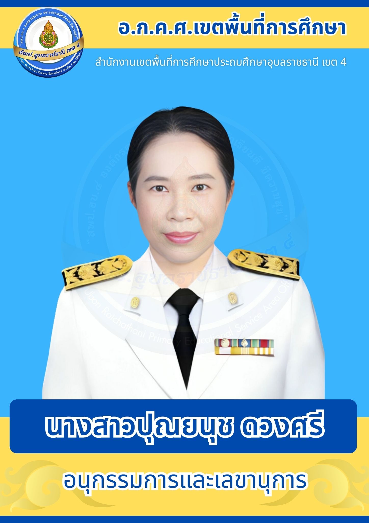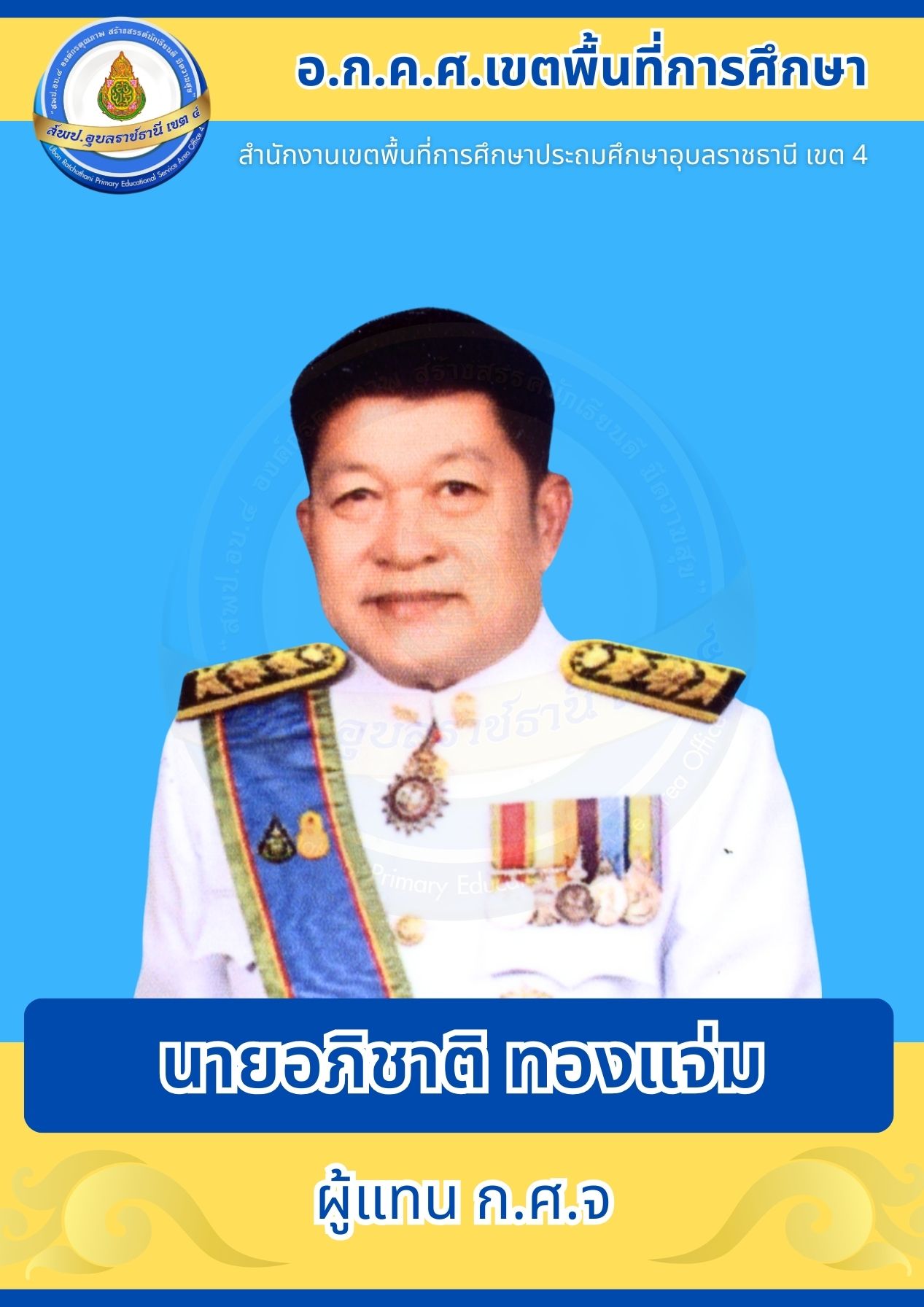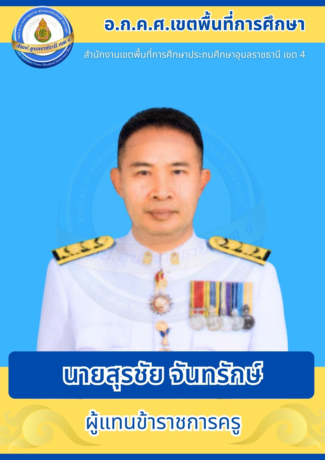 อ.ก.ค.ศ. สพป.อุบลราชธานี เขต 4 อ.ก.ค.ศ. เขตพื้นที่การศึกษา โครงสร้างและอำนาจหน้าที่ ประธานอนุกรรมการข้าราชการครูและบุคลากรทางการศึกษาเขตพื้นที่การศึกษาประถมศึกษาอุบลราชธานี เขต 4 คณะอนุกรรมการข้าราชการครูและบุคลากรทางการศึกษาเขตพื้นที่การศึกษาประถมศึกษาอุบลราชธานี เขต 4 ก่อนหน้า ต่อไป