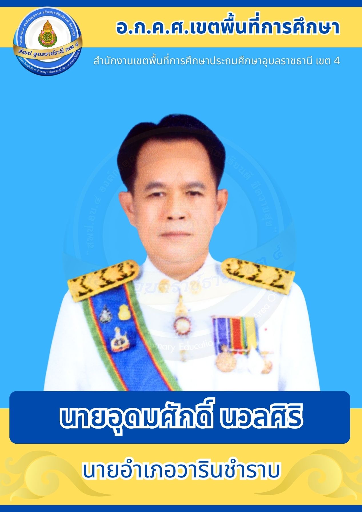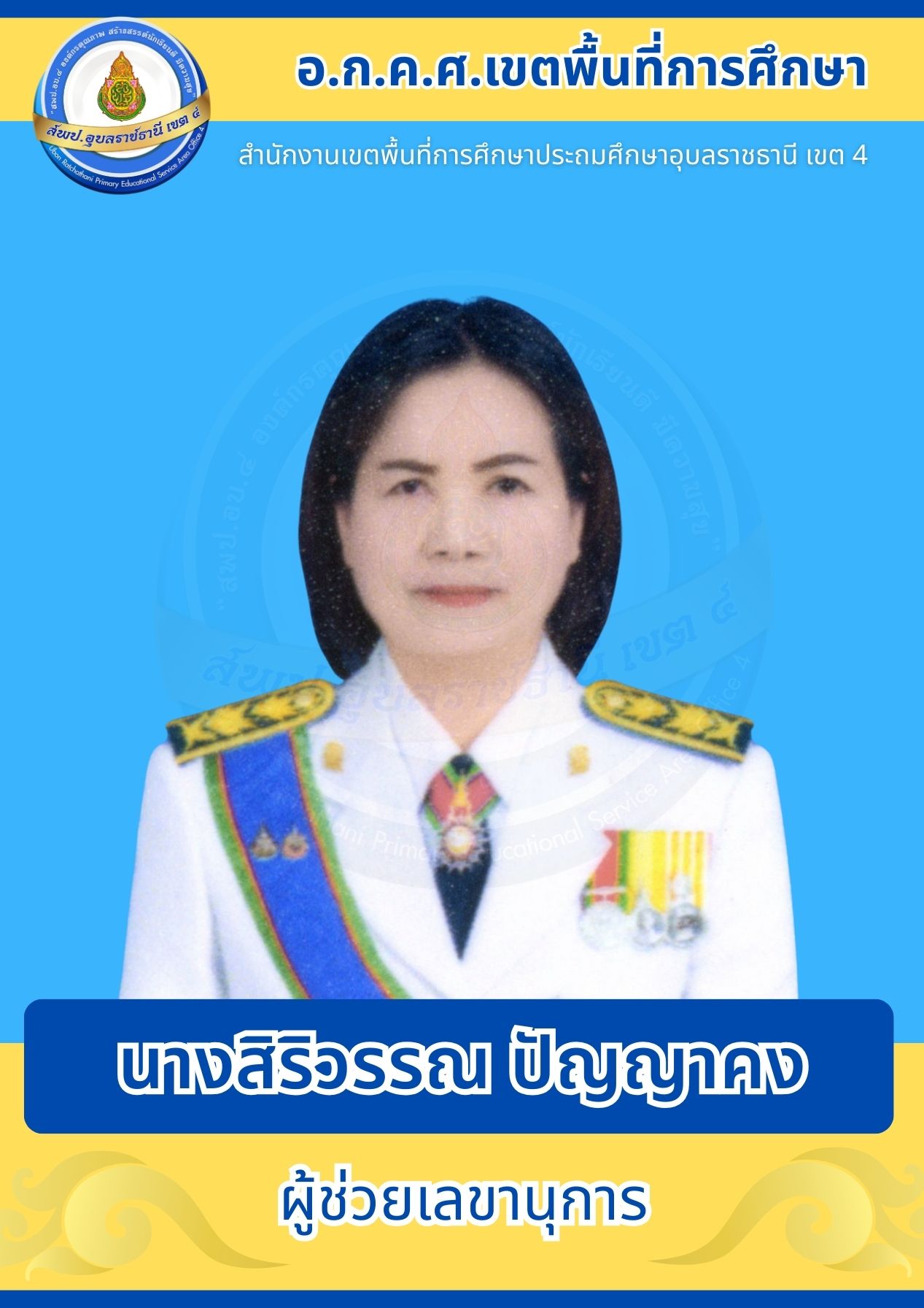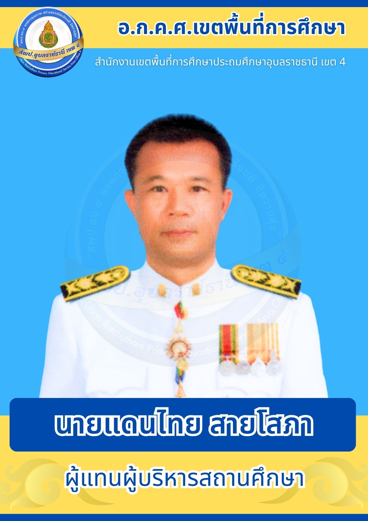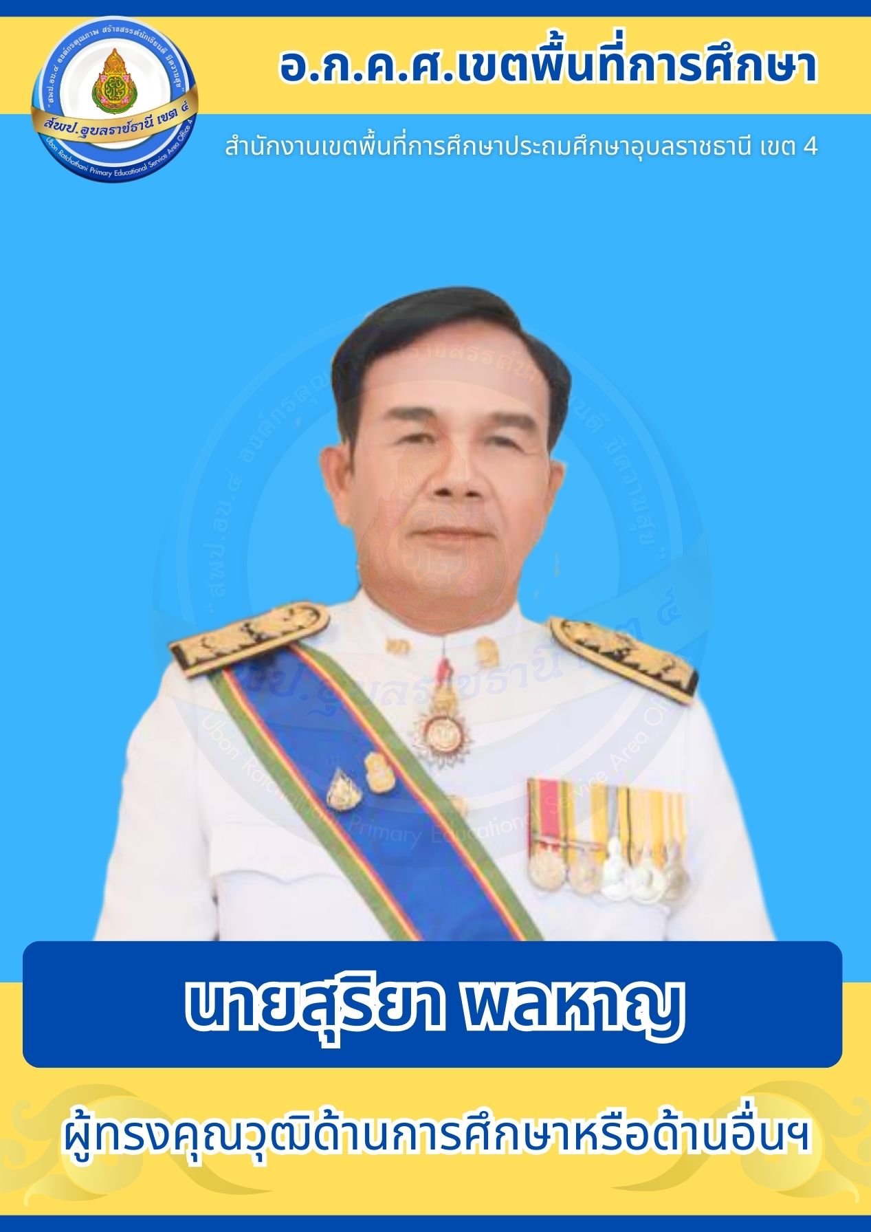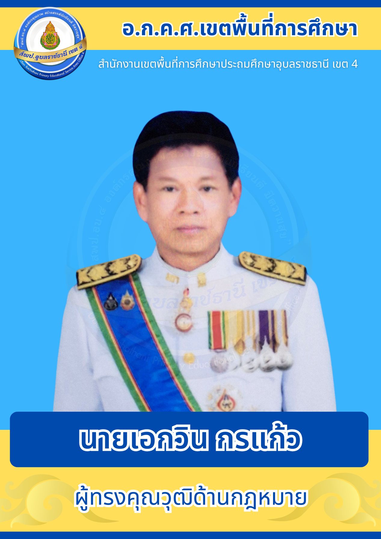 อ.ก.ค.ศ. สพป.อุบลราชธานี เขต 4 อ.ก.ค.ศ. เขตพื้นที่การศึกษา โครงสร้างและอำนาจหน้าที่ ประธานอนุกรรมการข้าราชการครูและบุคลากรทางการศึกษาเขตพื้นที่การศึกษาประถมศึกษาอุบลราชธานี เขต 4 คณะอนุกรรมการข้าราชการครูและบุคลากรทางการศึกษาเขตพื้นที่การศึกษาประถมศึกษาอุบลราชธานี เขต 4 ก่อนหน้า ต่อไป