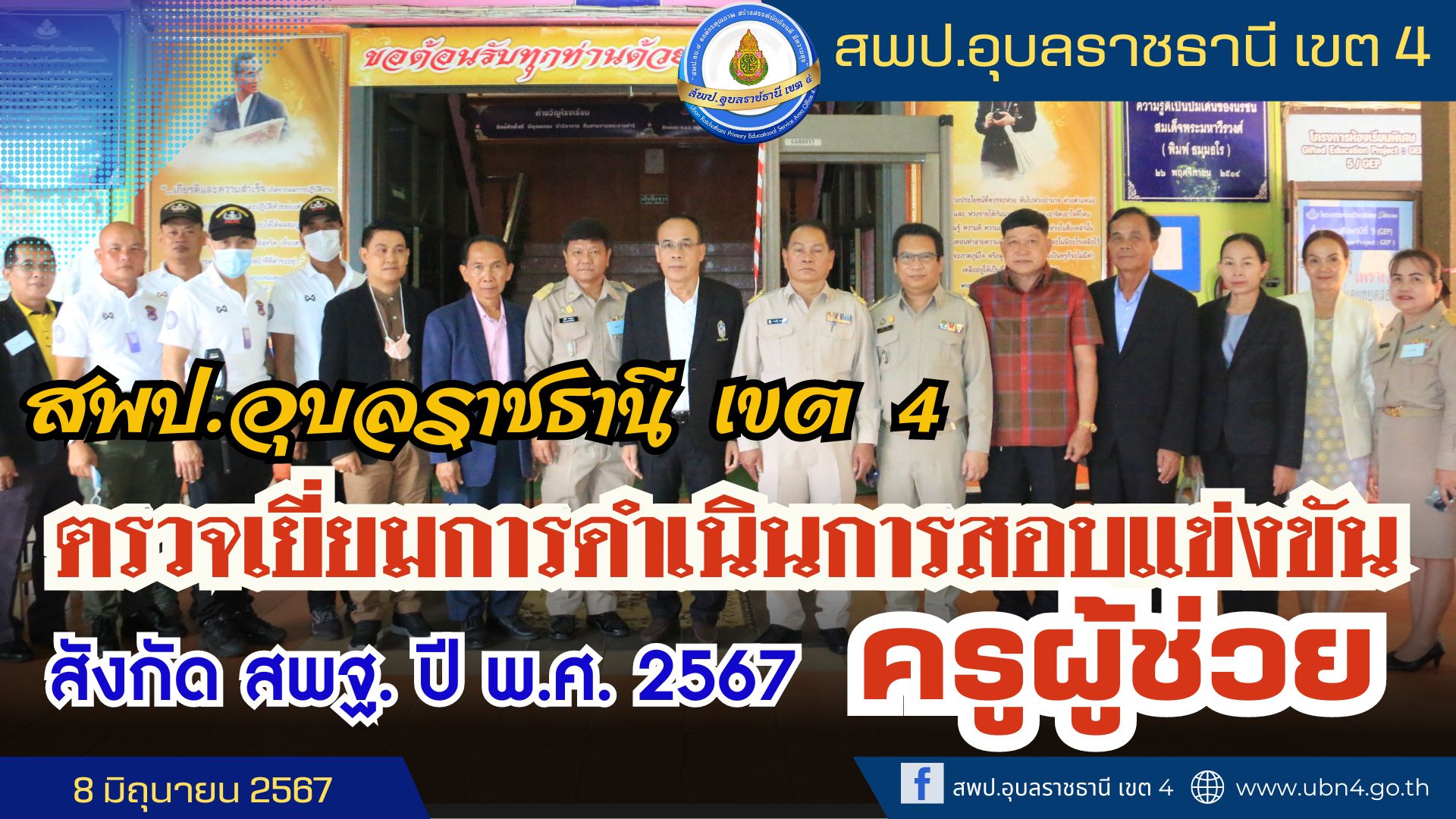 นายชาญชัย ทองแสน ผู้อำนวยการสำนักงานเขตพื้นที่การศึกษาประถมศึกษาอุบลราชธาน เขต 4 ประธานคณะกรรมการดำเนินการการสอบแข่งขันเพื่อบรรจุและแต่งตั้งบุคคเข้ารับราชการ เป็นข้าราชการครูและบุคลากรทางการศึกษา ตำแหน่ง ครูผู้ช่วย สังกัดสำนักงานคณะกรรมการการศึกษาขั้นพื้นฐาน ปี พ.ศ. 2567 พร้อมด้วย ดร.วีระศักดิ์ คำล้าน รอง ผอ.สพป.อุบลราชธานี เขต 4 ชี้แจง เน้นย้ำแนวทางการปฏิบัติหน้าที่แก่คณะกรรมการกำกับการสอบ ให้เป็นไปด้วยความบริสุทธิ์ ยุติธรรม โปร่งใส ตรวจสอบได้ ในการสอบแข่งขันเพื่อบรรจุและแต่งตั้งบุคคลเข้ารับราชการเป็นข้าราชการครูและบุคลากรทางการศึกษา ตำแหน่งครูผู้ช่วย สังกัดสำนักงานคณะกรรมการการศึกษาขั้นพื้นฐาน ปี พ.ศ. 2567 ในการสอบภาค ก และ ภาค ข ระหว่างวันที่ 8 - 9 มิถุนายน 2567 ณ สนามสอบโรงเรียนมูลนิธิวัดศรีอุบลรัตนาราม อำเภอเมือง จังหวัดอุบลราชธานี