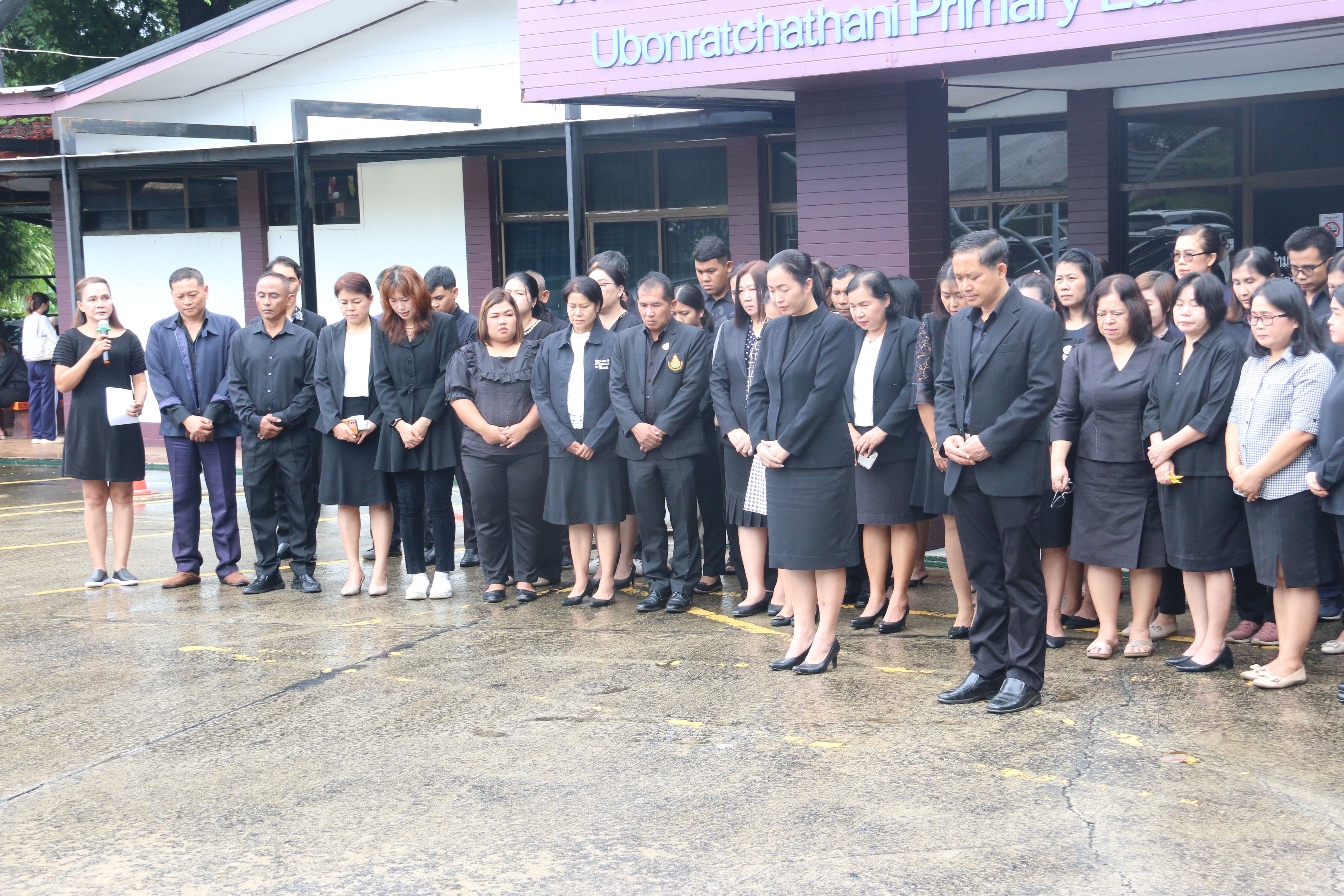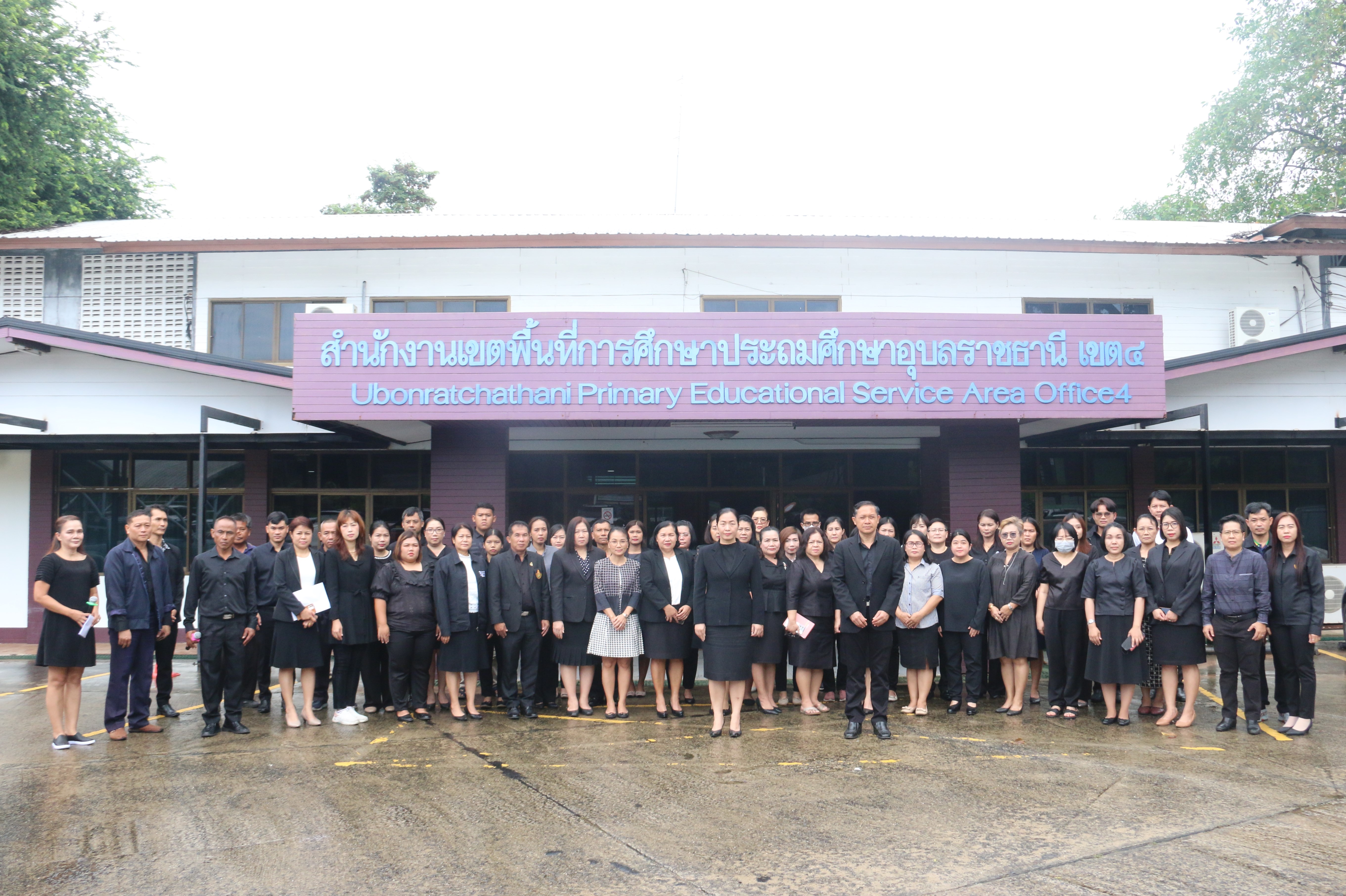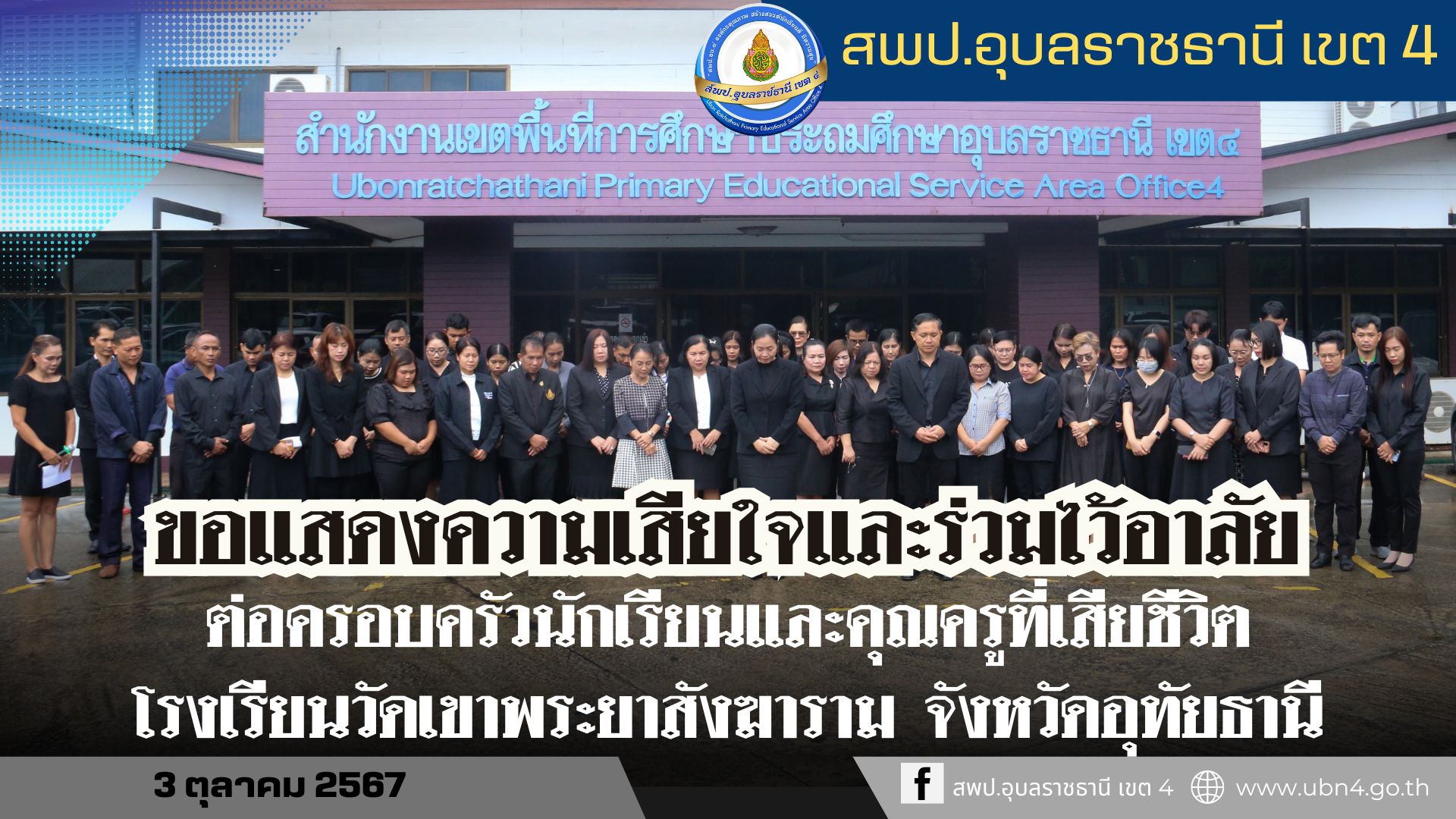 นางวันดี ละศรีจันทร์ รองผู้อำนวยการสำนักงานเขตพื้นที่การศึกษาประถมศึกษาอุบลราชธานี เขต 4 พร้อมด้วย ดร.ศักดิ์สิทธิ์ สุภสร รองผู้อำนวยการสำนักงานเขตพื้นที่การศึกษาประถมศึกษาอุบลราชธานี เขต 4 นำบุคลากรในสังกัดร่วมยืนสงบนิ่งเพื่อไว้อาลัยแด่นักเรียนและคุณครูที่เสียชีวิต จากเหตุการณ์รถบัสทัศนศึกษาเกิดเพลิงไหม้ โรงเรียนวัดเขาพระยาสังฆาราม จังหวัดอุทัยธานี เมื่อวันที่ 3 ตุลาคม 2567 ณ บริเวณหน้าอาคารอำนวยการ สพป.อุบลราชธานี เขต 4