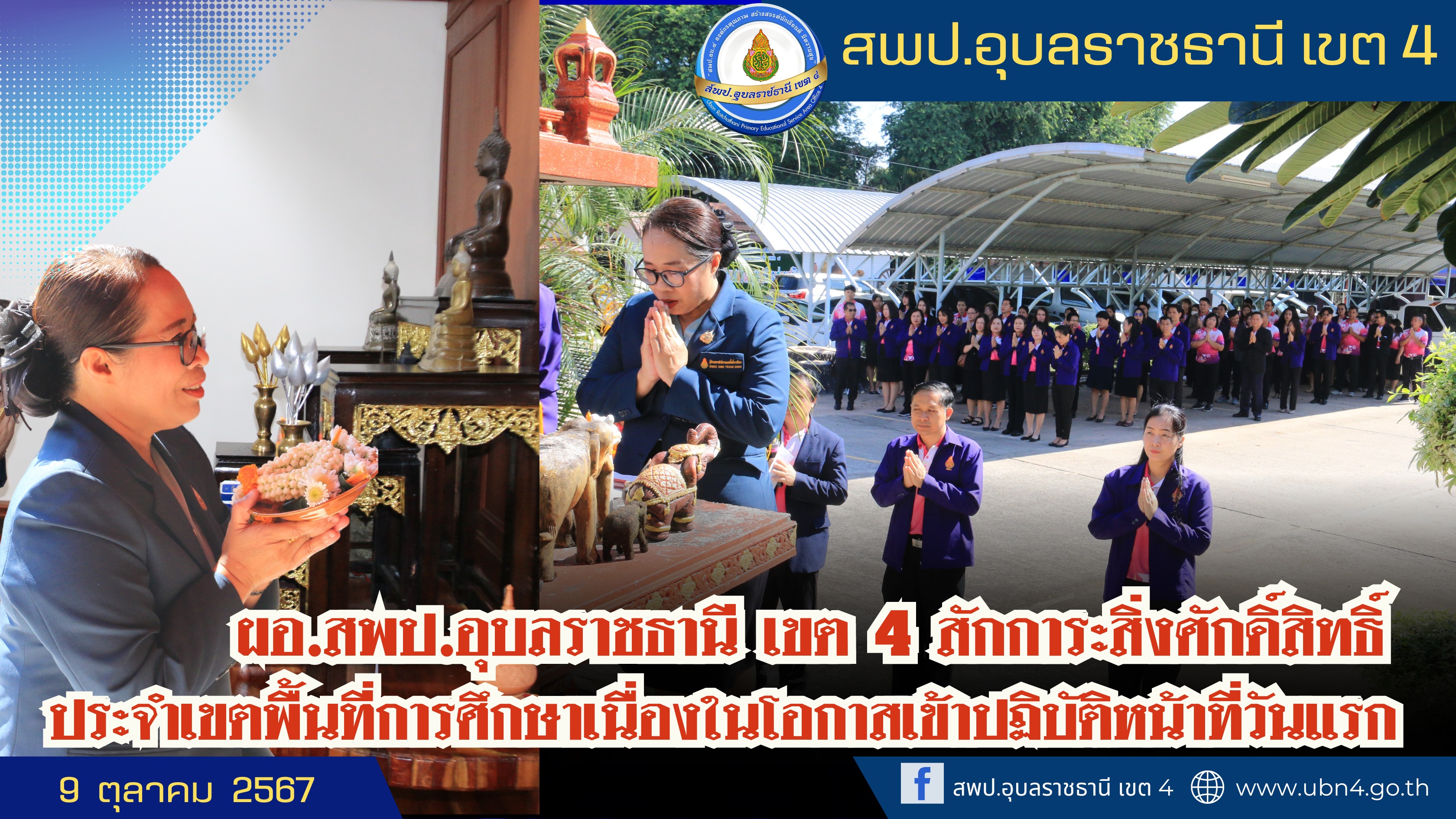 นางสาวปุณยนุช ดวงศรี ผู้อำนวยการสำนักงานเขตพื้นที่การศึกษาประถมศึกษาอุบลราชธานี เขต 4 สักการะสิ่งศักดิ์สิทธิ์ประจำเขตพื้นที่การศึกษา เนื่องในโอกาสเข้าปฏิบัติงานวันแรก ในตำแหน่งผู้อำนวยการสำนักงานเขตพื้นที่การศึกษาประถมศึกษาอุบลราชธานี เขต 4 โดยมี นางวันดี ละศรีจันทร์ ดร.ศักดิ์สิทธิ์ สุภสร รองผู้อำนวยการสำนักงานเขตพื้นที่การศึกษาประถมศึกษาอุบลราชธานี เขต 4 พร้อมด้วย ผู้อำนวยการกลุ่ม/หน่วย ศึกษานิเทศก์และบุคลากรในสังกัดร่วมให้การต้อนรับ เมื่อวันที่ 9 ตุลาคม 2567 ณ สพป.อุบลราชธานี เขต 4