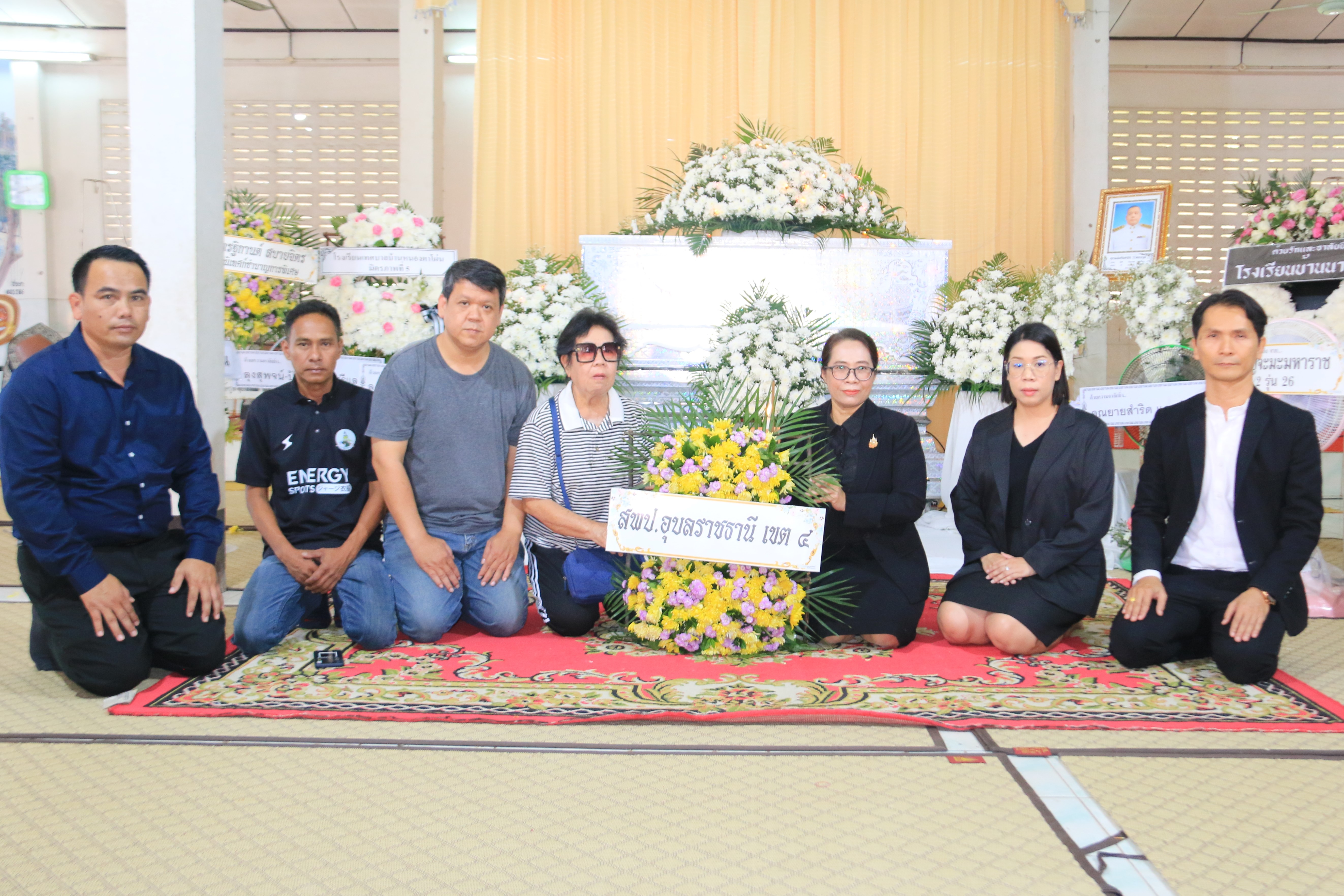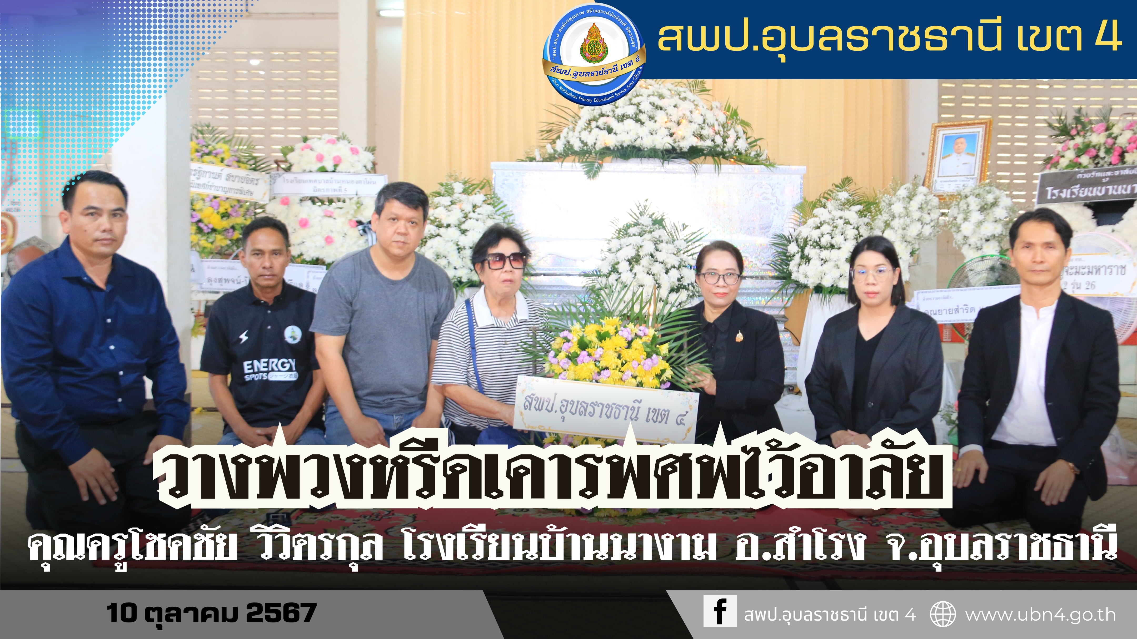 วันที่ 10 ตุลาคม 2567 เวลา 10.30 น.นางสาวปุณยนุช ดวงศรี ผู้อำนวยการสำนักงานเขตพื้นที่การศึกษาประถมศึกษาอุบลราชธานี เขต 4 พร้อมด้วย นายวิสุทธิ์ เหมือนเหลา นางสาวสิริพรรณ สมสาร์ ศึกษานิเทศก์ชำนาญการพิเศษ ร่วมวางพวงหรีดเคารพศพและไว้อาลัยต่อการจากไปของ นายโชคชัย วิวิตรกุล ครูชำนาญการ โรงเรียนบ้านนางาม อำเภอสำโรง จังหวัดอุบลราชธานี โดยตั้งศพบำเพ็ญกุศล ณ ศาลาบำเพ็ญกุศล วัดวรรณวารี ตำบลวารินชำราบ อำเภอวารินชำราบ จังหวัดอุบลราชธานี ระหว่างวันที่ 9-11 ตุลาคม 2567 และกำหนดฌาปนกิจศพ ในวันเสาร์ที่ 12 ตุลาคม 2567 เวลา 16.00 น. ณ เมรุวัดวรรณาวารี ตำบลวารินชำราบ อำเภอวารินชำราบ จังหวัดอุบลราชธานี