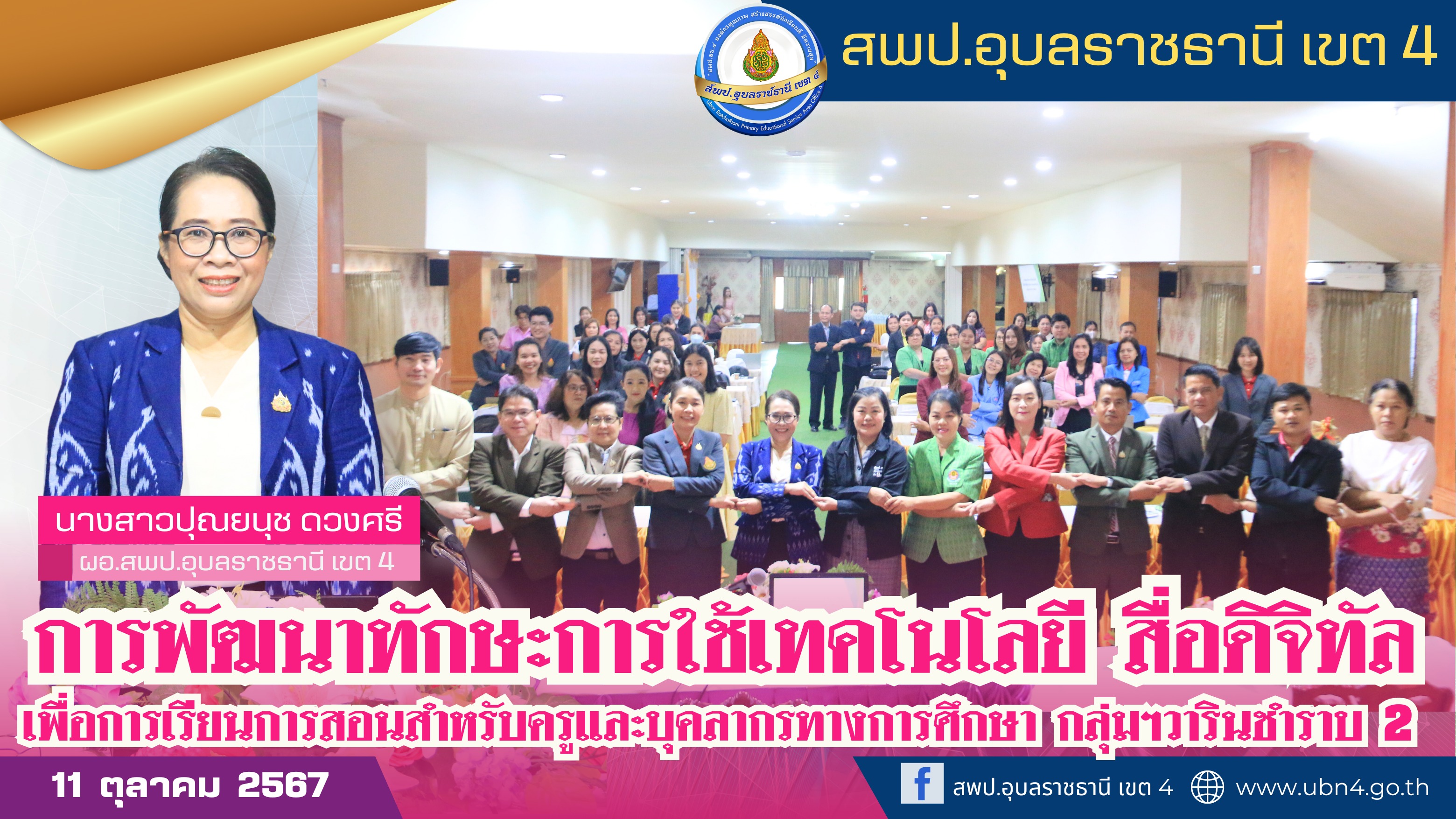 นางสาวปุณยนุช ดวงศรี ผู้อำนวยการสำนักงานเขตพื้นที่การศึกษาประถมศึกษาอุบลราชธานี เขต 4 ประธานพิธีเปิดการพัฒนาทักษะการใช้เทคโนโลยี สื่อดิจิทัลเพื่อการเรียนการสอนสำหรับครูและบุคลากรทางการศึกษา กลุ่มส่งเสริมประสิทธิภาพการศึกษาวารินชำราบ 2 โดยมี นายศักดิ์ชัย คำยนต์ รองประธานกลุ่มส่งเสริมประสิทธิภาพการศึกษาวารินชำราบ 2 กล่าวรายงานวัตถุประสงค์ โดยมี นางสาวพิไลลักษณ์ หมั่นวงศ์ ศึกษานิเทศก์ชำนาญการพิเศษ และผู้บริหารสถานศึกษาในกลุ่มส่งเสริมประสิทธิภาพการศึกษาวารินชำราบ 2 ร่วมเป็นเกียรติในพิธีเปิด เมื่อวันที่ 11 ตุลาคม 2567 ณ ห้องประชุมไทรทอง สำนักงานเขตพื้นที่การศึกษาประถมศึกษาอุบลราชธานี เขต 4
