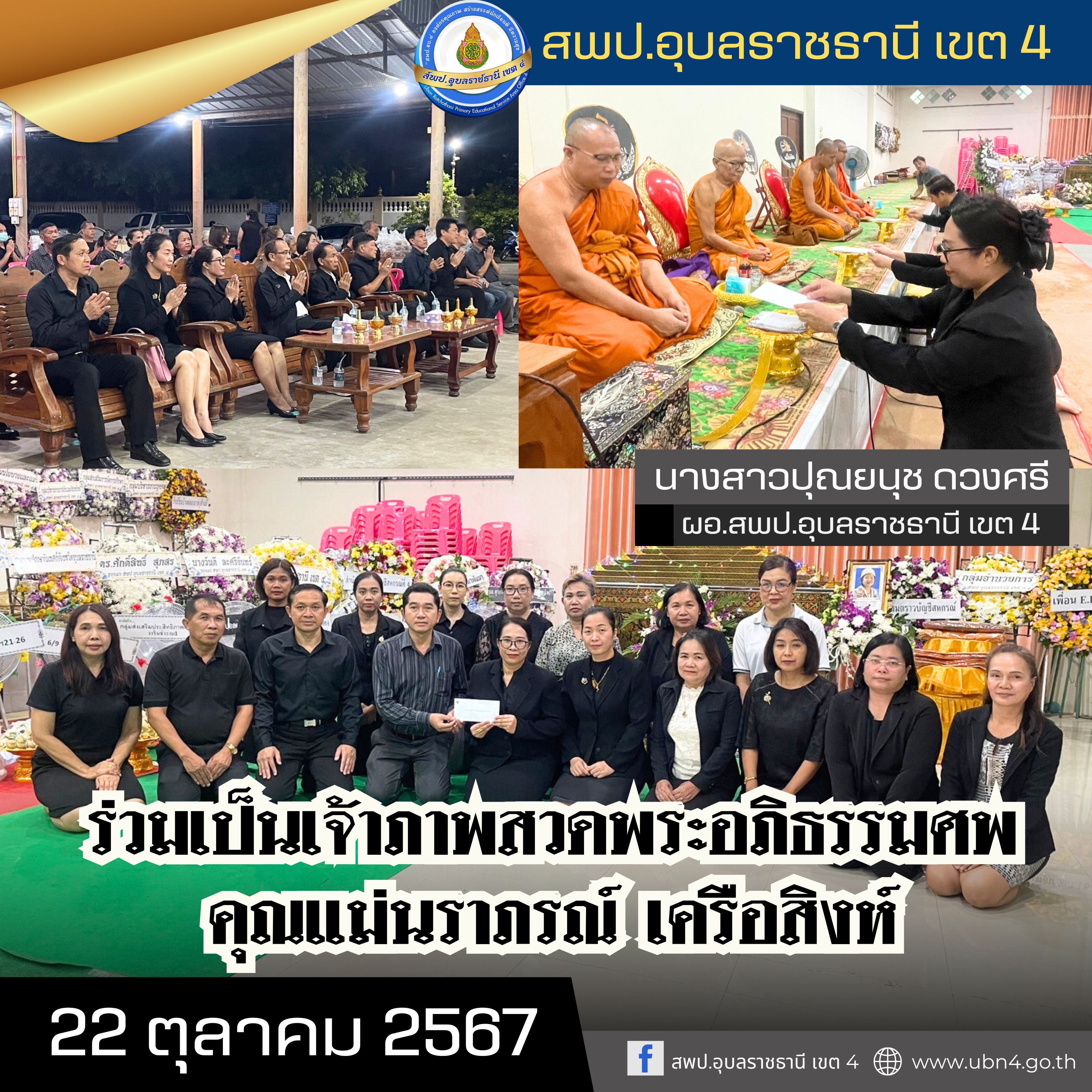 วันที่ 22 ตุลาคม 2567 นางสาวปุณยนุช ดวงศรี ผู้อำนวยการสำนักงานเขตพื้นที่การศึกษาประถมศึกษาอุบลราชธานี เขต 4 พร้อมด้วย นางวันดี ละศรีจันทร์ ดร.ศักดิ์สิทธิ์ สุภสร รองผู้อำนวยการสำนักงานเขตพื้นที่การศึกษาประถมศึกษาอุบลราชธานี เขต 4 และผู้อำนวยการกลุ่ม/หน่วย ศึกษานิเทศก์ และบุคลากรในสังกัด ร่วมแสดงความเสียใจและเป็นเจ้าภาพสวดพระอภิธรรมศพ คุณแม่นราภรณ์ เครือสิงห์ มารดาของนายมรกต เครือสิงห์ ศึกษานิเทศก์ชำนาญการพิเศษ พร้อมมอบเงินช่วยเหลือครอบครัวผู้วายชนม์ ทั้งนี้ พิธีสวดพระอภิธรรมศพจะมีขึ้นระหว่างวันที่ 20-22 ตุลาคม 2567 และจะมีพิธีฌาปนกิจศพในวันที่ 23 ตุลาคม 2567 เวลา 15.00 น. ณ เมรุวัดป่าแสนอุดม ตำบลในเมือง อำเภอเมือง จังหวัดอุบลราชธานี