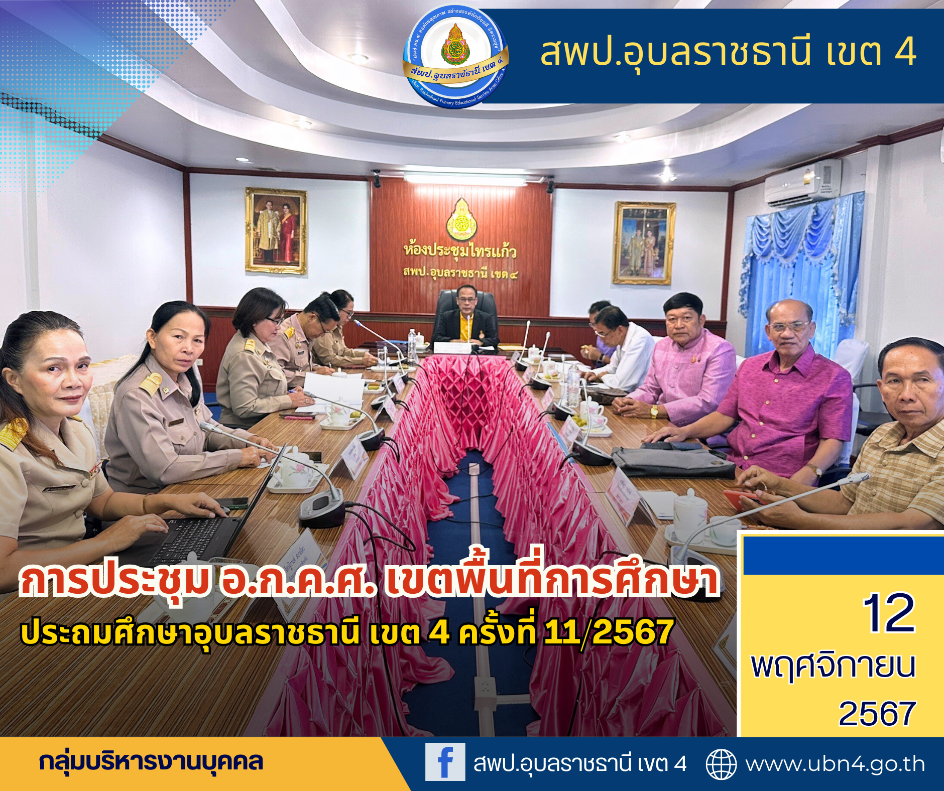 เมื่อวันที่ 12 พฤศจิกายน 2567 นายเธียนไท คำล้าน ประธาน อ.ก.ค.ศ.เขตพื้นที่การศึกษาประถมศึกษาอุบลราชธานี เขต 4 พร้อมทั้งคณะ อ.ก.ค.ศ เขตพื้นที่การศึกษาประถมศึกษาอุบลราชธานี เขต 4 เข้าร่วมการประชุม อ.ก.ค.ศ. เขตพื้นที่การศึกษาประถมศึกษาอุบลราชธานี เขต 4 ครั้งที่ 11/2567 ณ ห้องประชุมไทรแก้ว สพป.อุบลราชธานี เขต 4