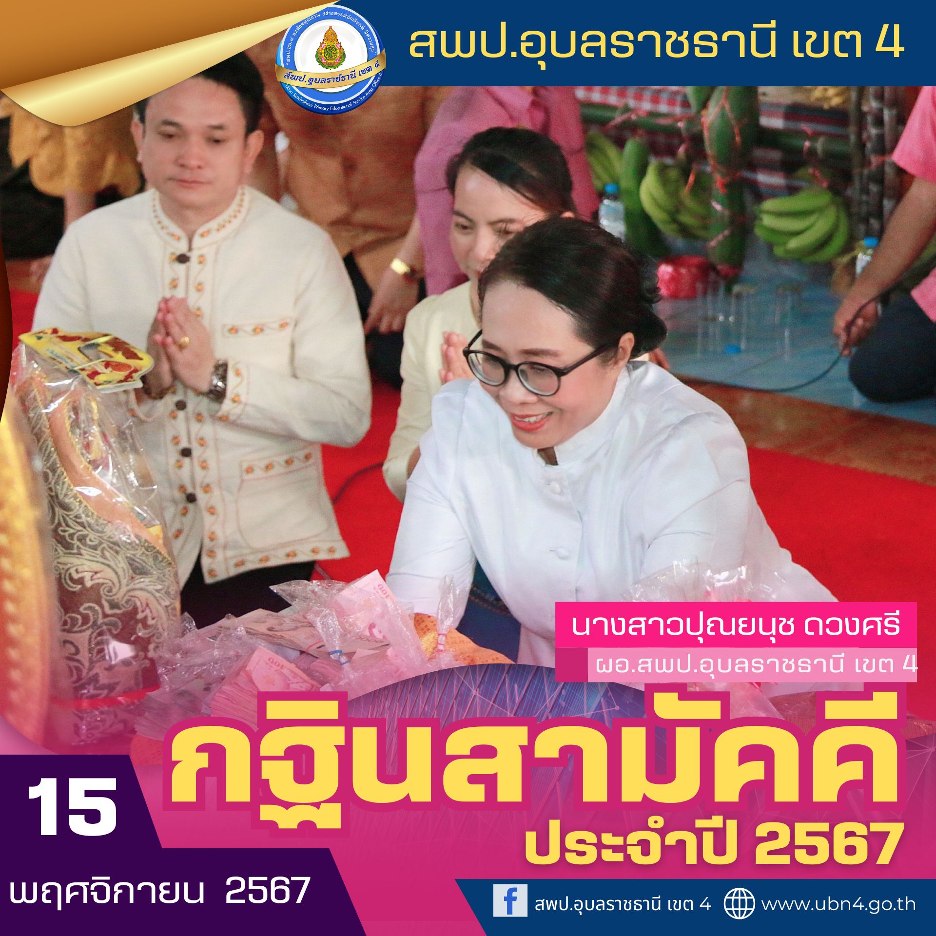 วันที่ 15 พฤศจิกายน 2567 นางสาวปุณยนุช ดวงศรี ผู้อำนวยการสำนักงานเขตพื้นที่การศึกษาประถมศึกษาอุบลราชธานี เขต 4 พร้อมด้วย นายศักดิ์สิทธิ์ สุภสร นายวีระชัย ไกยรัตน์ นางจันจิรา ศรีจันทร์ รองผู้อำนวยการสำนักงานเขตพื้นที่การศึกษาประถมศึกษาอุบลราชธานี เขต 4 และคณะ ลงพื้นที่ตรวจเยี่ยมโรงเรียนบ้านกุดปลาขาว เพื่อรับทราบการดำเนินงานตามนโยบายและติดตามการจัดการเรียนการสอน