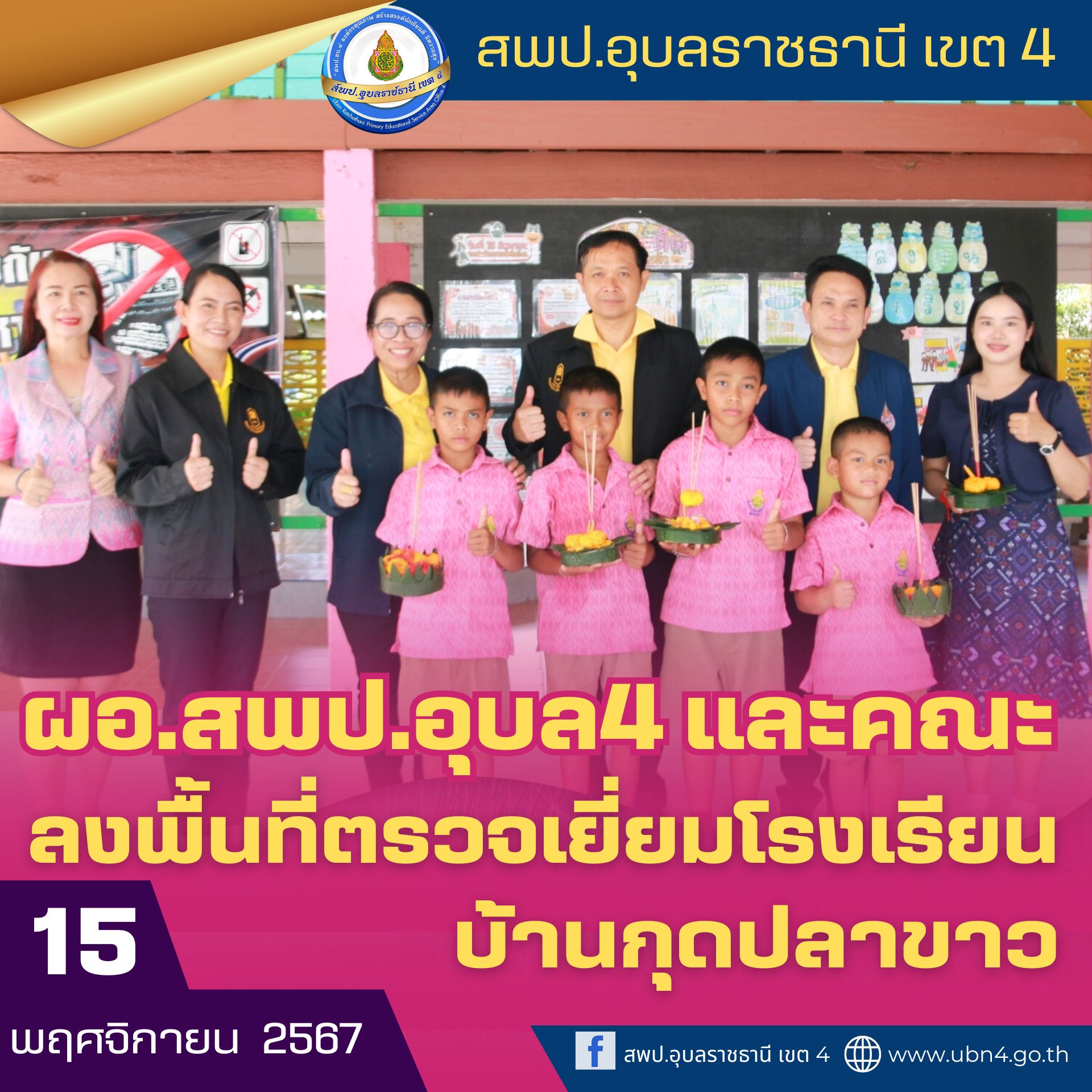 ผอ.สพป.อุบลราชธานี เขต 4 และคณะ ลงพื้นที่ตรวจเยี่ยมให้กำลังใจครูและนักเรียนโรงเรียนบ้านกุดปลาขาว