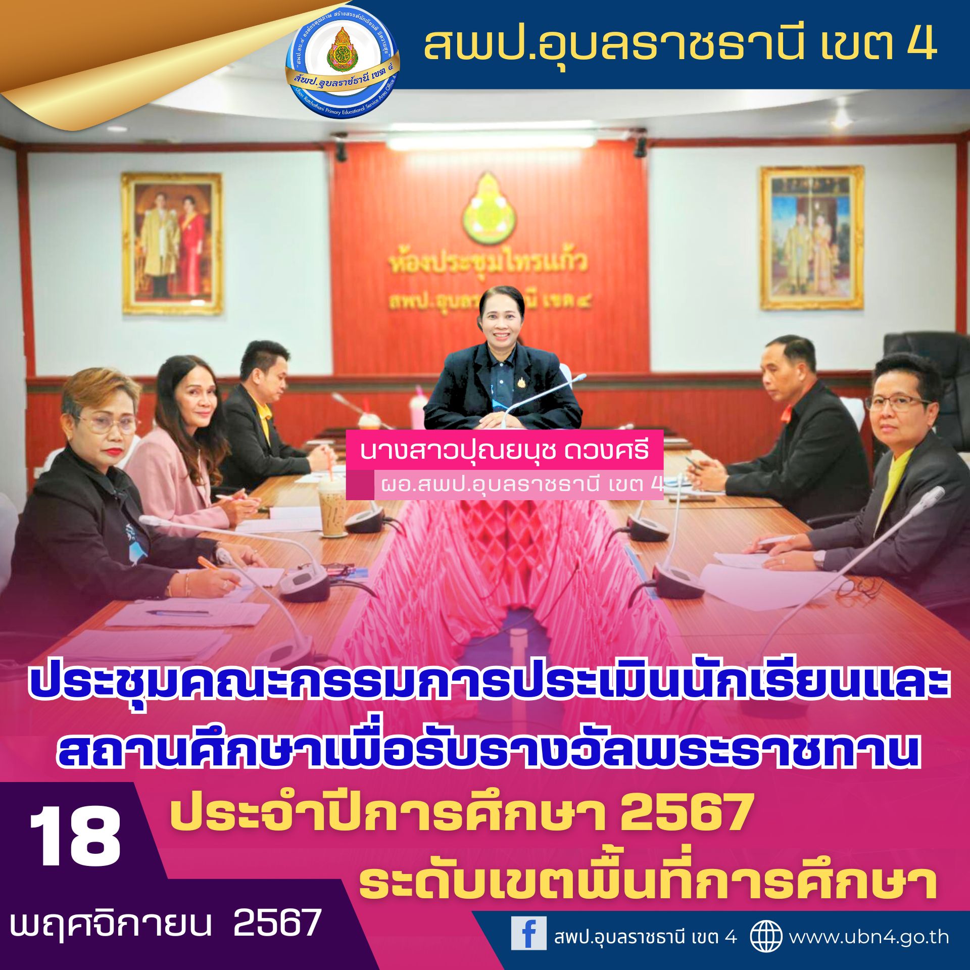 นางสาวปุณยนุช ดวงศรี ผู้อำนวยการสำนักงานเขตพื้นที่การศึกษาประถมศึกษาอุบลราชธานี เขต 4 ประธานคณะกรรมการเปิดการประชุมคณะกรรมการประเมินนักเรียนและสถานศึกษาเพื่อรับรางวัลพระราชทาน ประจำปีการศึกษา 2567 ระดับเขตพื้นที่การศึกษา โดยมีวัตถุประสงค์เพื่อกำหนดเกณฑ์และมาตรฐานในการประเมินผลงานให้มีความชัดเจนและเป็นธรรม ในการคัดเลือกนักเรียนและสถานศึกษาที่มีคุณสมบัติเหมาะสมเป็นตัวแทนของเขตพื้นที่การศึกษาเข้าร่วมการประกวดในระดับที่สูงขึ้น