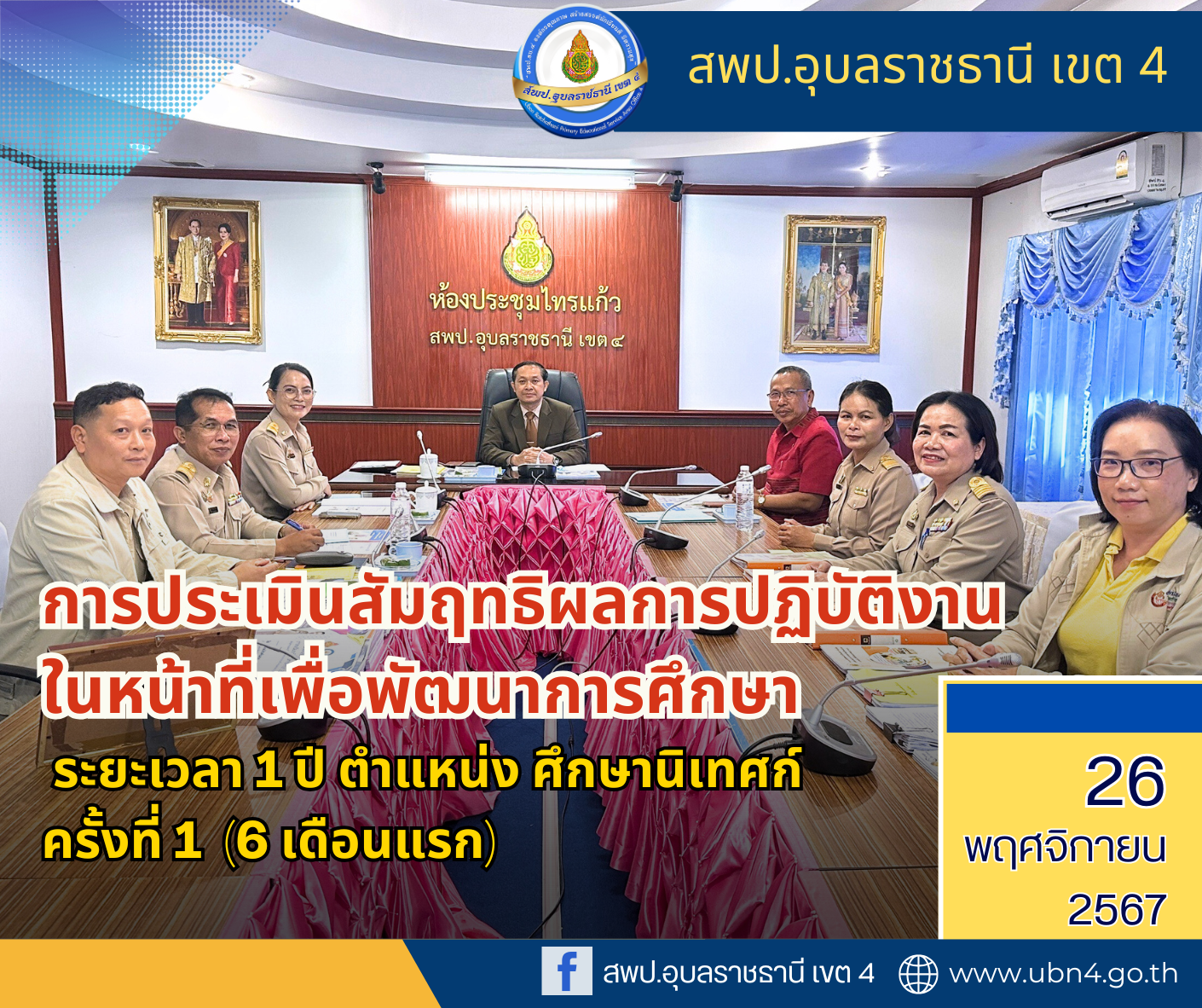 เมื่อวันที่ 26 พฤศจิกายน 2567 นางสาวปุณยนุช ดวงศรี ผู้อำนวยการ สพป.อุบลราชธานี เขต 4 มอบหมายให้ นายศักดิ์สิทธิ์ สุภสร รองผู้อำนวยการ สพป.อุบลราชธานี เขต 4 นางจันจิรา ศรีจันทร์ รองผู้อํานวยการ สพป.อุบลราชธานี เขต 4 พร้อมทั้งคณะกรรมการประเมิน ร่วมการประเมินสัมฤทธิผลการปฏิบัติงานในหน้าที่เพื่อพัฒนาการศึกษา ระยะเวลา 1 ปี สำหรับผู้ได้รับการบรรจุและแต่งตั้งให้ดำรงตำแหน่ง ศึกษานิเทศก์ สำนักงานเขตพื้นที่การศึกษาประถมศึกษาอุบลราชธานี เขต 4 ครั้งที่ 1 (6 เดือนแรก) จำนวน 2 ราย คือ นางรัชนีกร วรรณทะเสน และนายเดชธนา กัญญาพันธ์ ณ ห้องประชุมไทรแก้ว สำนักงานเขตพื้นที่การศึกษาประถมศึกษาอุบลราชธานี เขต 4