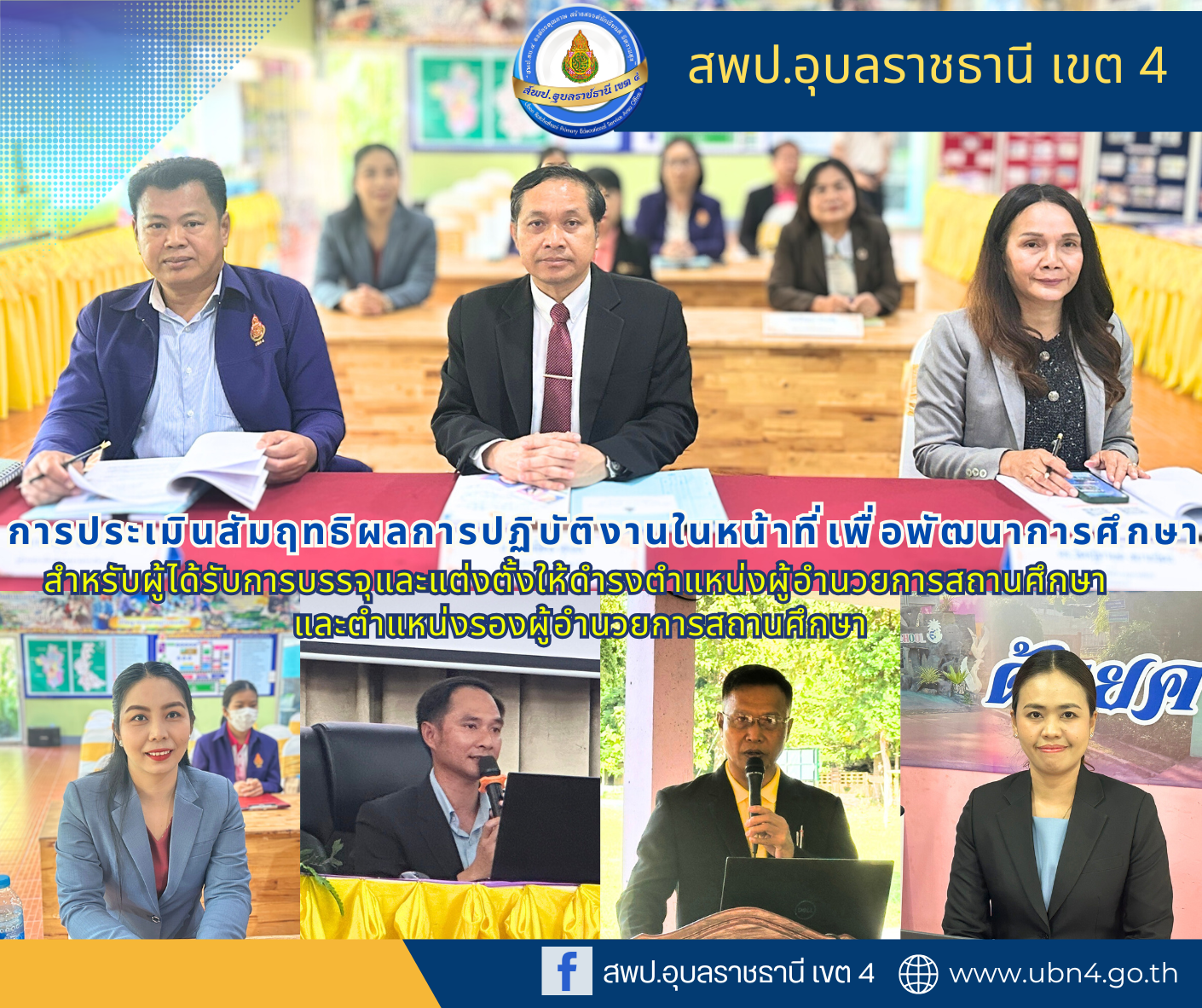 เมื่อวันที่ 27 พฤศจิกายน 2567 นางสาวปุณยนุช ดวงศรี ผู้อำนวยการ สพป.อุบลราชธานี เขต 4 มอบหมายให้ นายศักดิ์สิทธิ์ สุภสร รองผู้อำนวยการ สพป.อุบลราชธานี เขต 4 พร้อมด้วยคณะกรรมการประเมินสัมฤทธิผลการปฏิบัติงานในหน้าที่ ประกอบด้วย นายนุชิต เถาว์โท ผู้อำนวยการโรงเรียนอนุบาลสว่างวีระวงศ์ และนางจิตรฐิกานต์ สบายจิตร ศึกษานิเทศก์ชำนาญการพิเศษ ดำเนินการประเมินสัมฤทธิผลการปฏิบัติงานในหน้าที่เพื่อพัฒนาการศึกษา ระยะเวลา 1 ปี สำหรับผู้ได้รับการบรรจุและแต่งตั้งให้ดำรงตำแหน่งผู้อำนวยการสถานศึกษา และตำแหน่งรองผู้อำนวยการสถานศึกษา ครั้งที่ 1 (6 เดือนแรก) ณ โรงเรียนบ้านนาจาน โรงเรียนชุมชนบ้านนาเยีย โรงเรียนบ้านผับแล้ง นาเจริญ และโรงเรียนบ้านสำโรง(คุรุประชาสามัคคี) สังกัดสำนักงานเขตพื้นที่การศึกษาประถมศึกษาอุบลราชธานี เขต 4