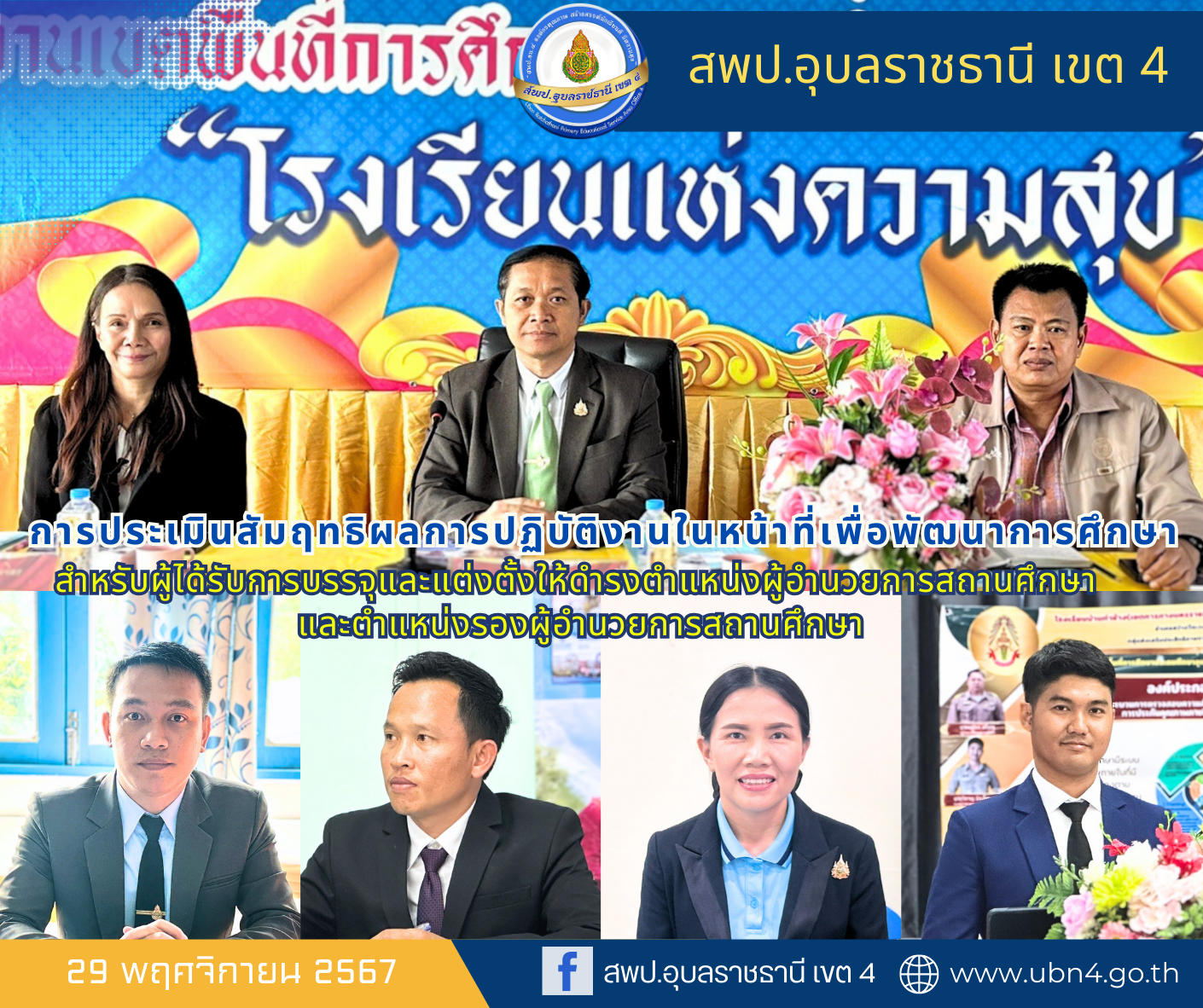 เมื่อวันที่ 29 พฤศจิกายน 2567 นางสาวปุณยนุช ดวงศรี ผู้อำนวยการ สพป.อุบลราชธานี เขต 4 มอบหมายให้ นายศักดิ์สิทธิ์ สุภสร รองผู้อำนวยการ สพป.อุบลราชธานี เขต 4 พร้อมด้วยคณะกรรมการประเมินสัมฤทธิผลการปฏิบัติงานในหน้าที่ ประกอบด้วย นายนุชิต เถาว์โท ผู้อำนวยการโรงเรียนอนุบาลสว่างวีระวงศ์ และนางจิตรฐิกานต์ สบายจิตร ศึกษานิเทศก์ชำนาญการพิเศษ ดำเนินการประเมินสัมฤทธิผลการปฏิบัติงานในหน้าที่เพื่อพัฒนาการศึกษา ระยะเวลา 1 ปี สำหรับผู้ได้รับการบรรจุและแต่งตั้งให้ดำรงตำแหน่งผู้อำนวยการสถานศึกษา และตำแหน่งรองผู้อำนวยการสถานศึกษา ครั้งที่ 1 (6 เดือนแรก) ณ โรงเรียนบ้านทุ่งเพียง โรงเรียนบ้านคำข่า โรงเรียนบ้านคำหมากอ่อน และโรงเรียนบ้านท่าช้าง(เขตการทางนครราชสีมาสงเคราะห์ 2) สังกัดสำนักงานเขตพื้นที่การศึกษาประถมศึกษาอุบลราชธานี เขต 4